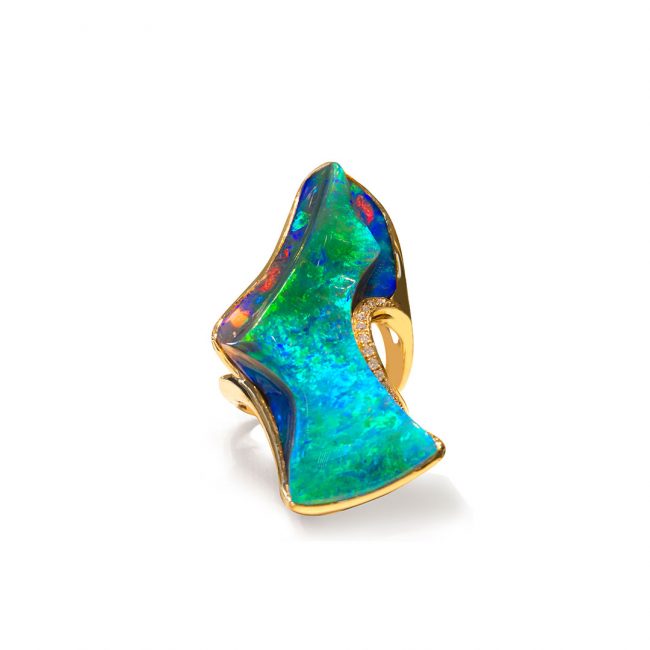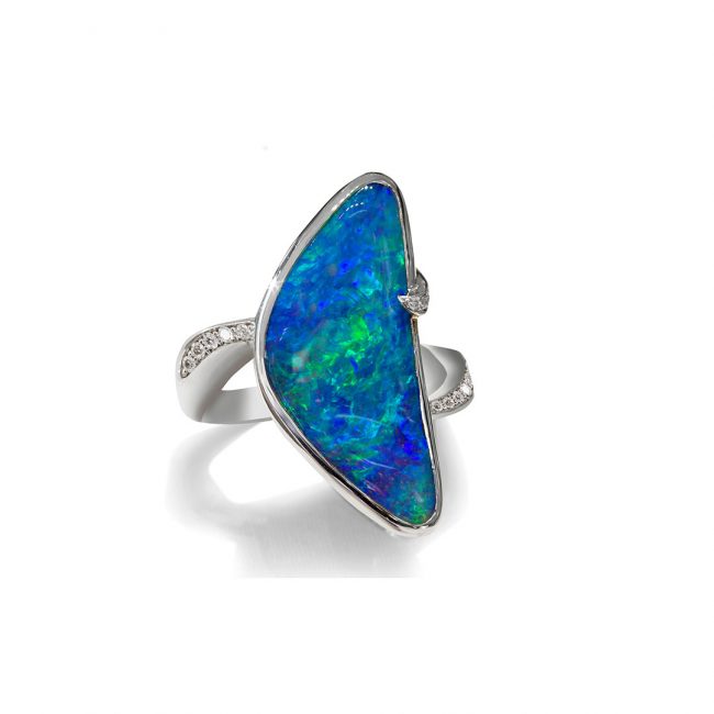 ZoomDetails Boulder Opal Ring in 18k with Diamonds featuring Segmented Colours of Blue and GreenOpals, RingsBy cosmoSeptember 21, 2017Enquire