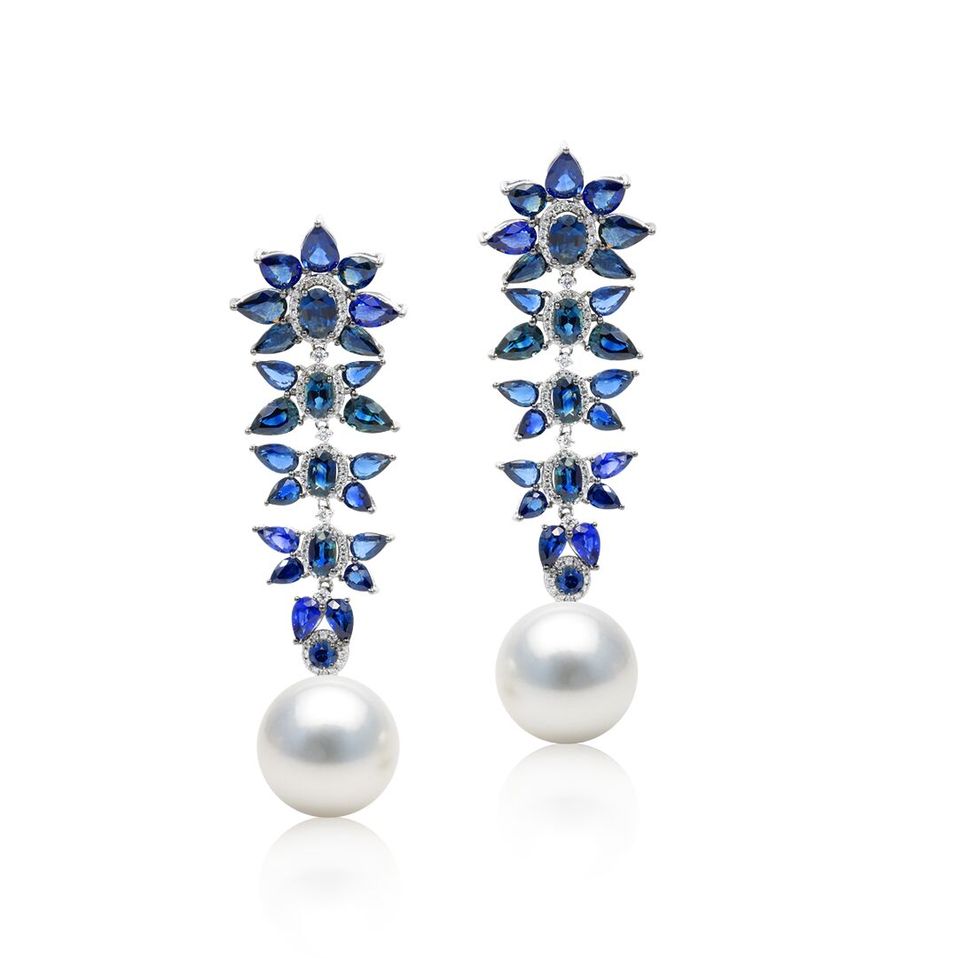 Australian White South Sea Pearl Earrings set in 18k with Blue Sapphires and Diamonds