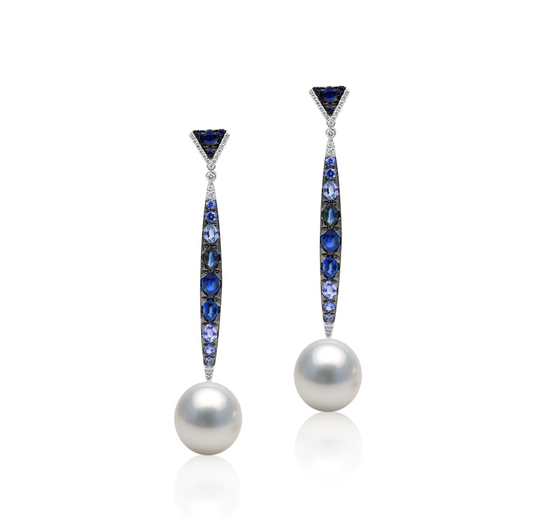 Australian White South Sea Pearl Earrings set in 18k with Blue Sapphires and Diamonds