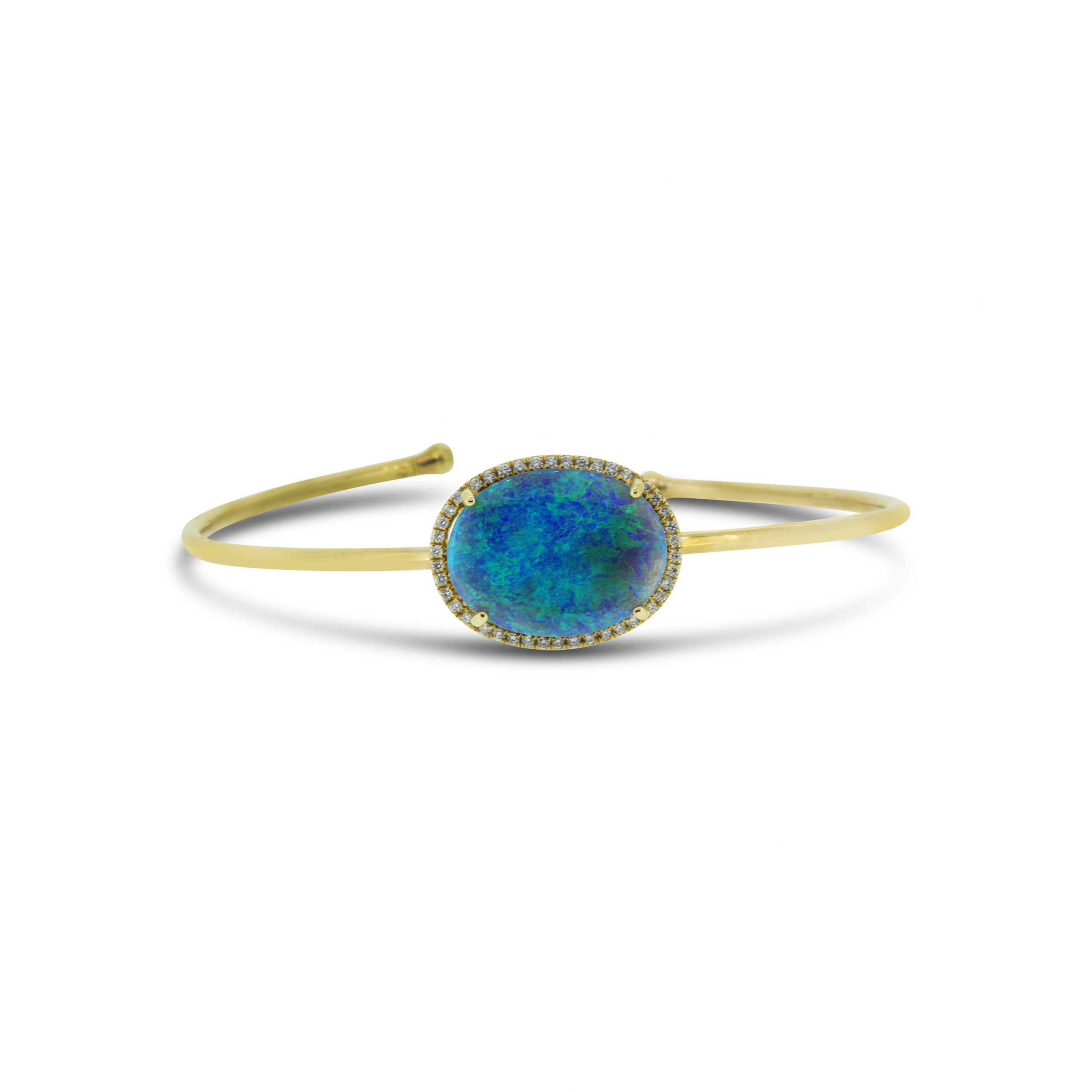 Black Opal Bangle set in 18k Yellow Gold with Diamonds displaying Rolling Flashes of Blues and Greens