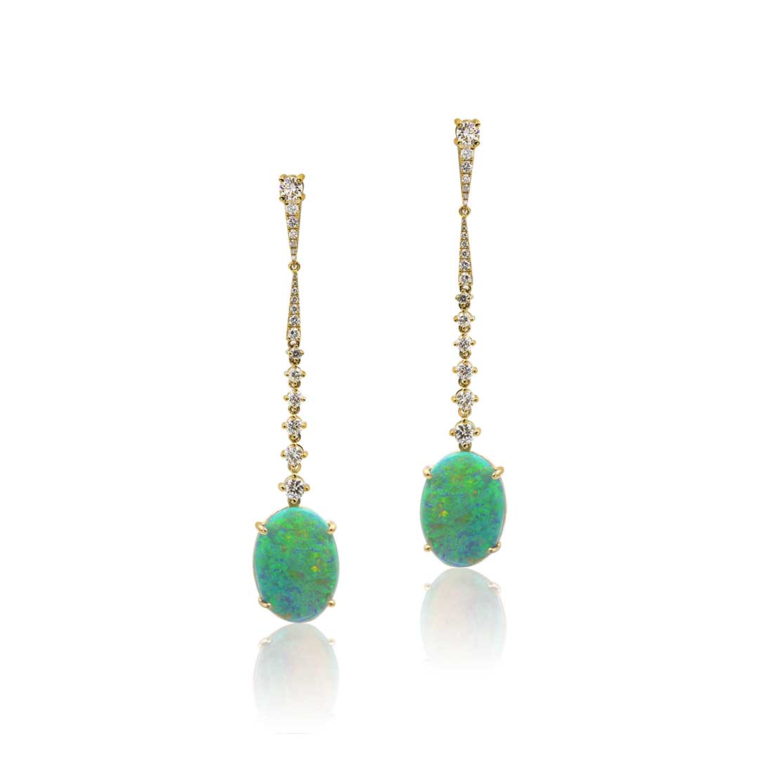 Black Opal Earrings set in 18k with Diamonds featuring Colours of Forest Ferns