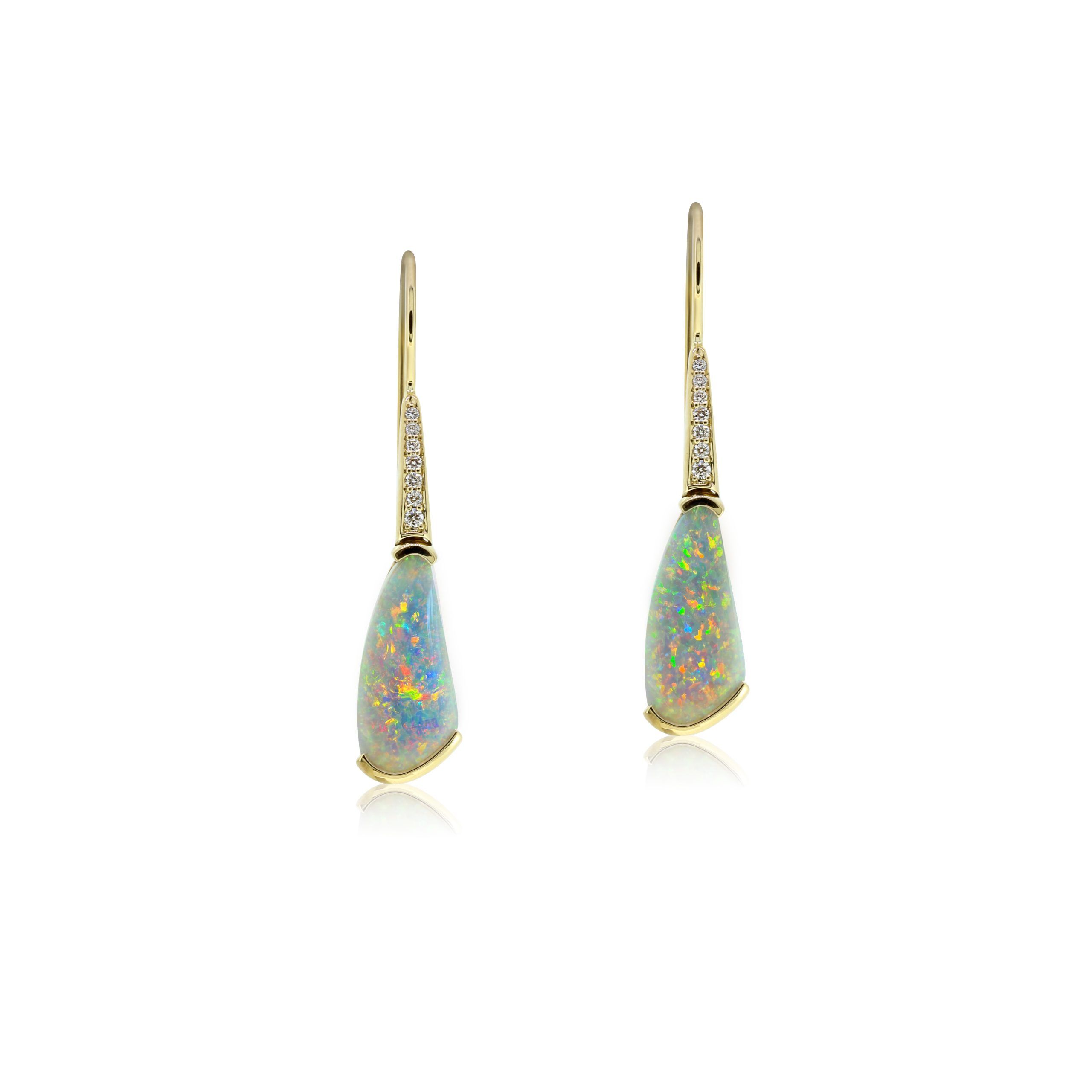 Black Opal Earrings set in 18k Yellow gold with Diamonds featuring a Whole Spectrum of Colours