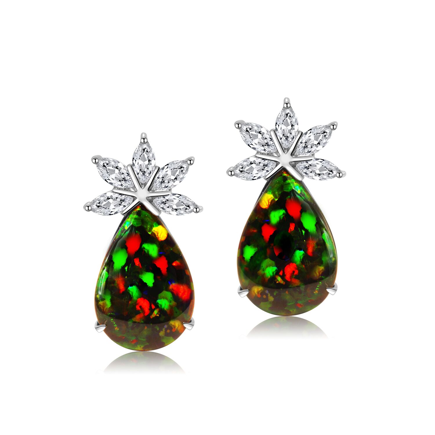 Black Opal Earrings set in Platinum with Diamonds featuring Flashes of Red and Green Colours