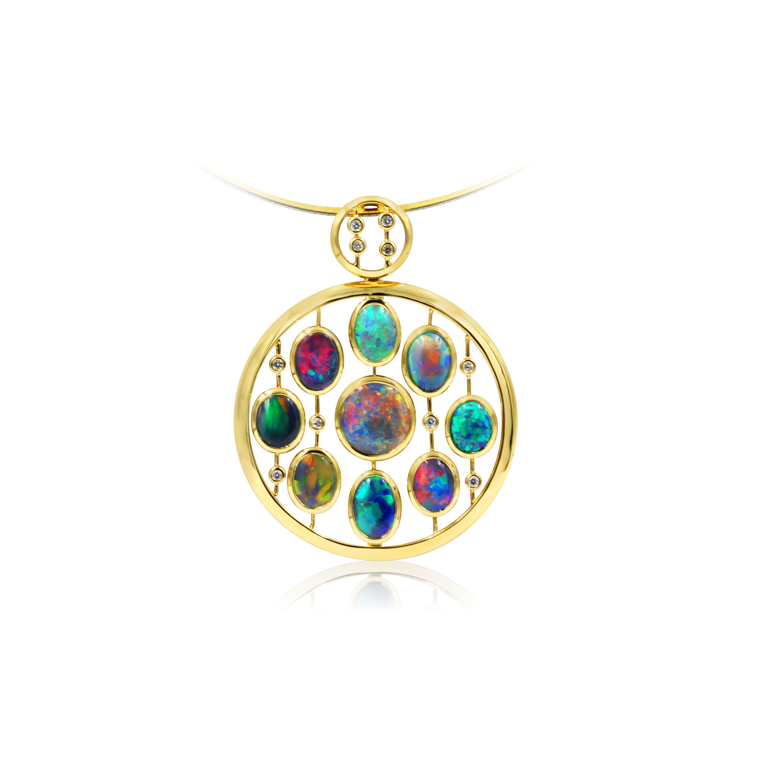 Black Opal Pendant set in 18k displaying Vivid Red, Blue and Green Colours