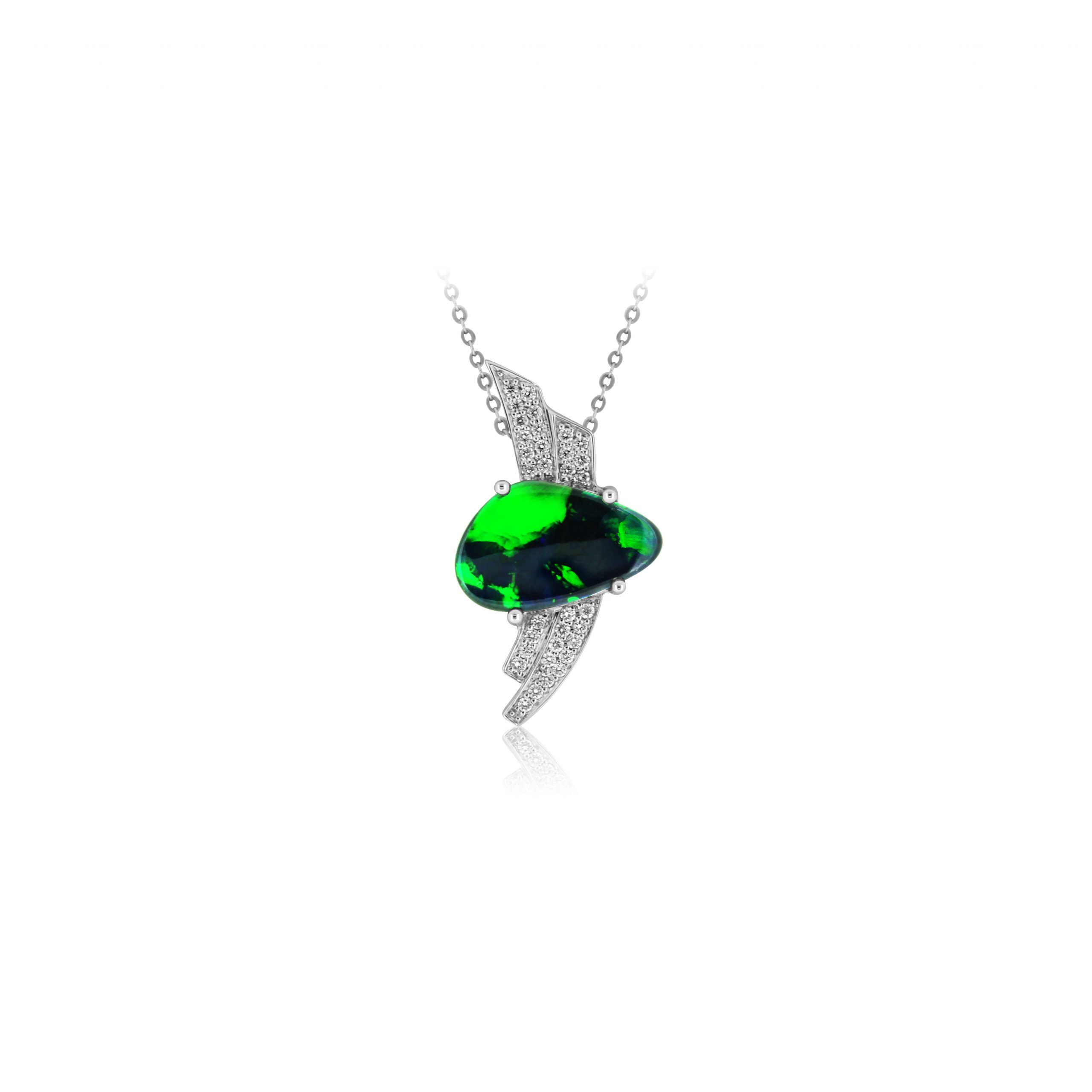 Black Opal Pendant set in 18k White Gold displaying Rolling Flash of Greens