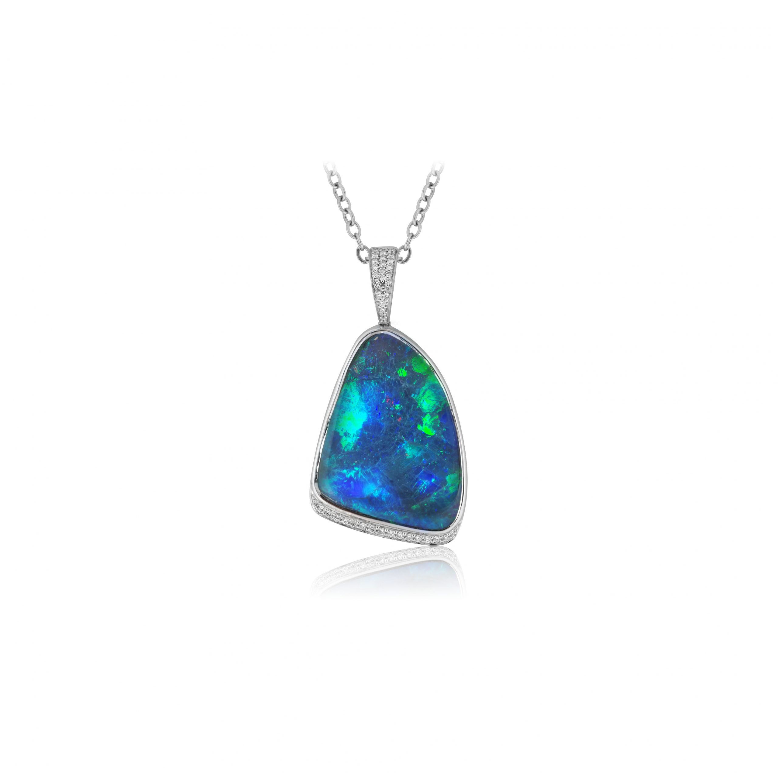 Black Opal Pendant set in 18k White Gold with Diamonds featuring Brilliant Flashes of Green, Blue and Red