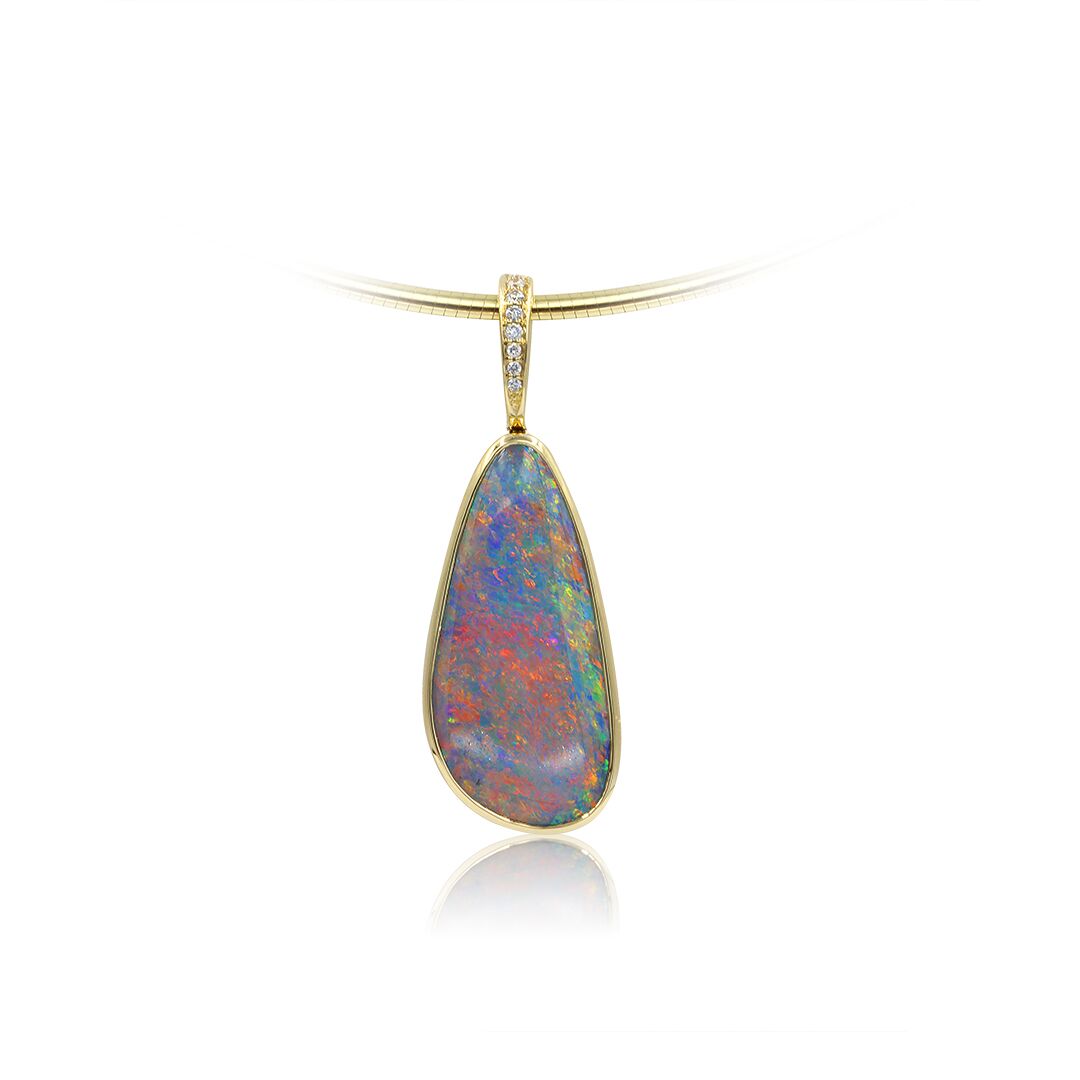 Black Opal Pendant set in 18k with Diamonds featuring Splash of Colours