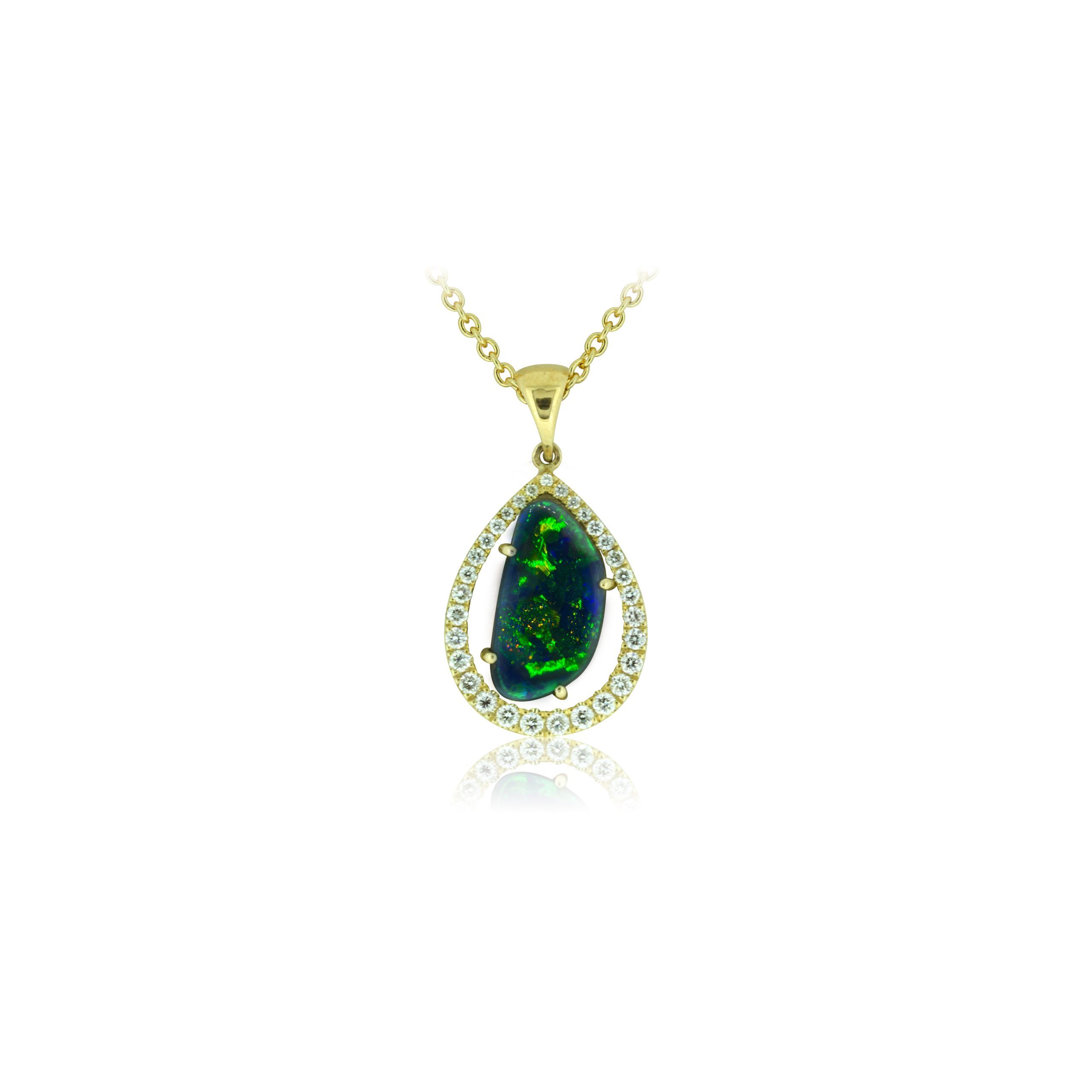 Black Opal Pendant set in 18k Yellow Gold with Diamonds featuring Brilliant Greens, Reds and Blues