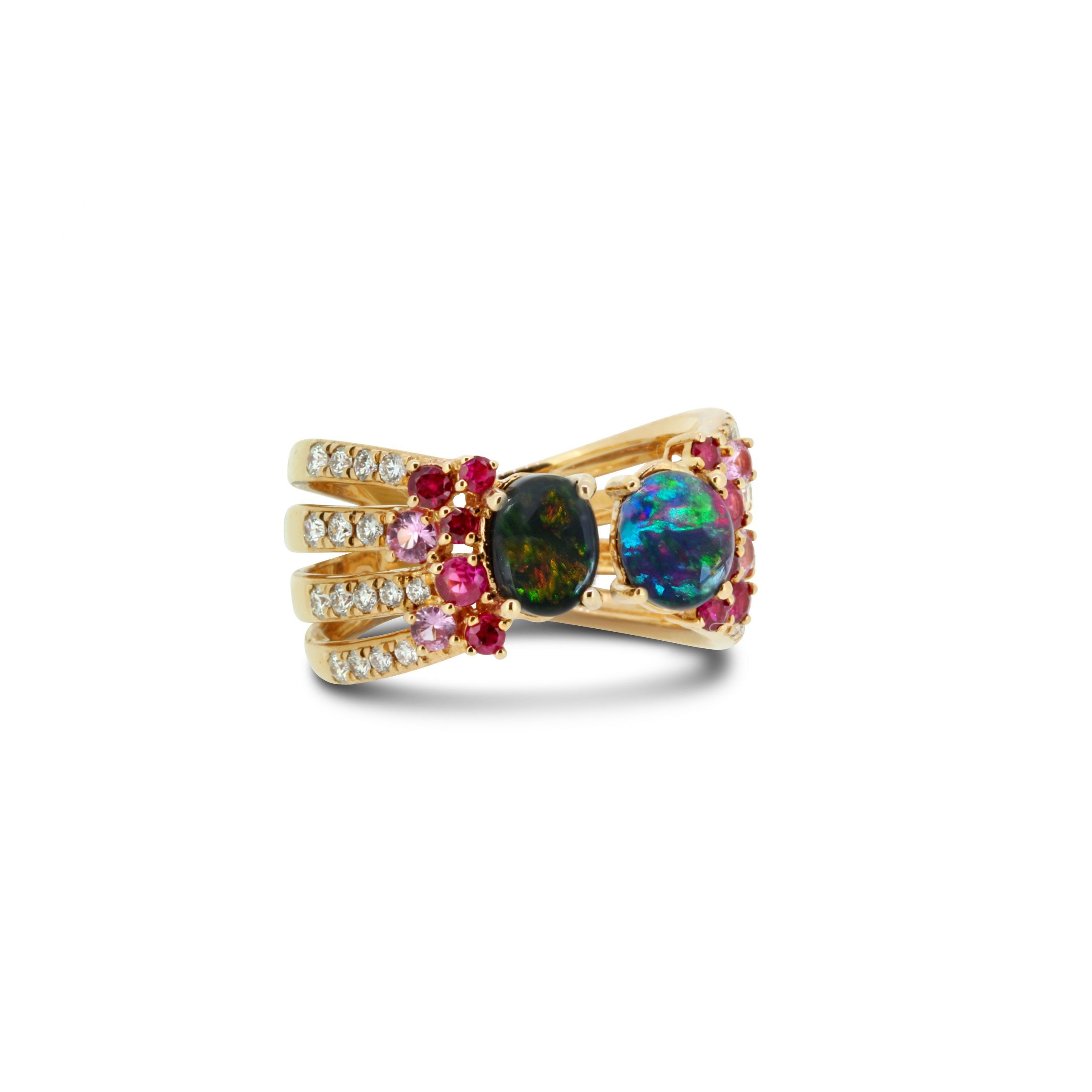 Black Opal Ring set in 18k Rose Gold with Diamonds, Rubies and Pink Sapphires featuring Flashes of Peacock Colours