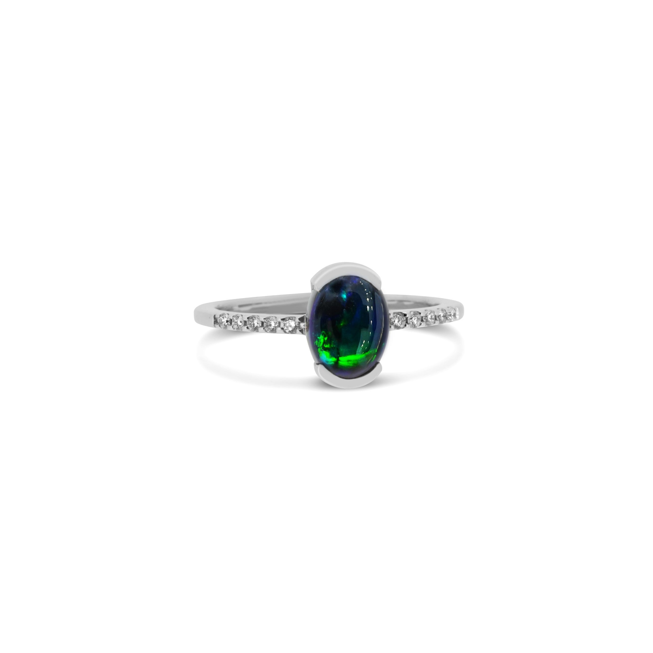 Black Opal Ring set in 18k White Gold with Diamonds displaying Vivid Greens on Midnight Blue