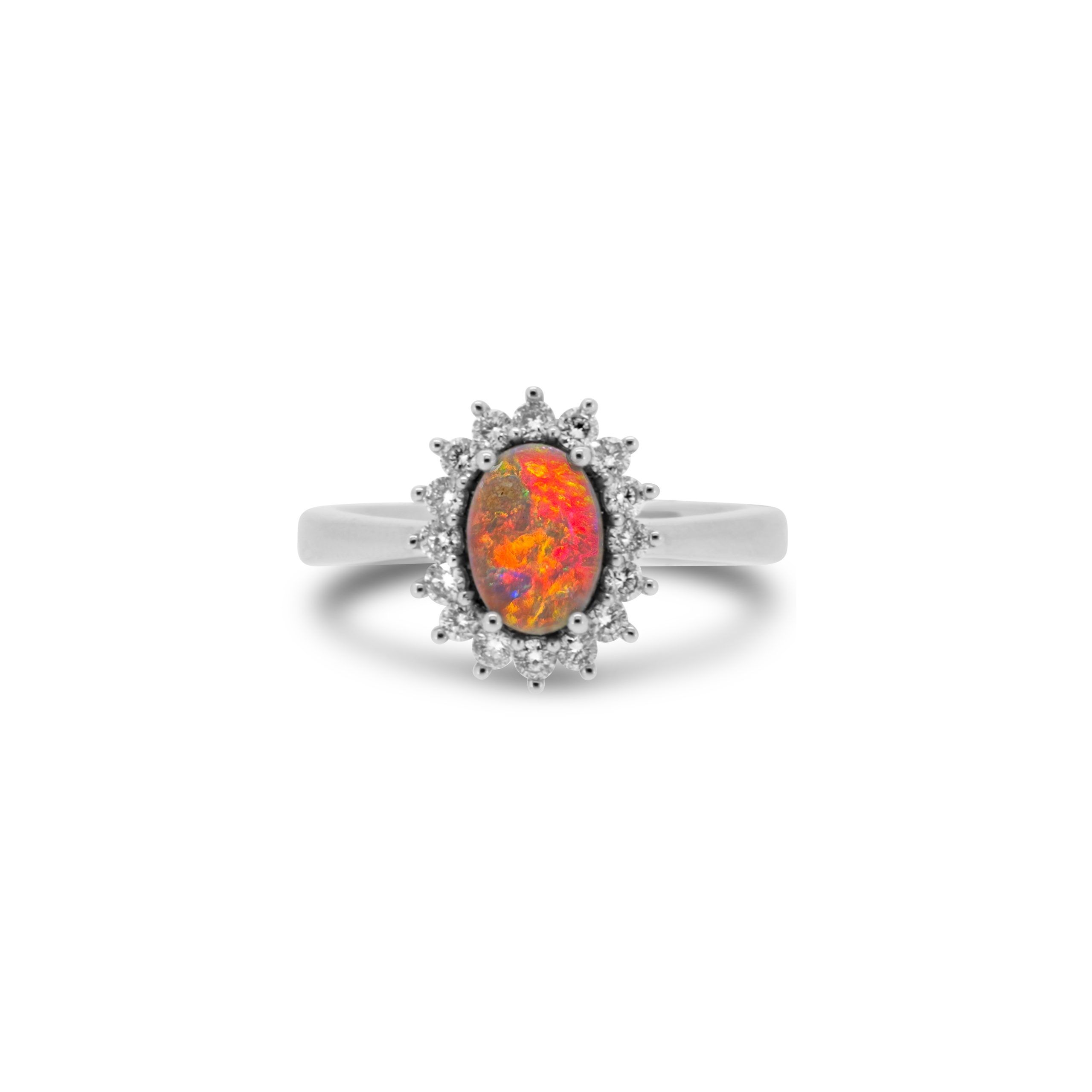 Black Opal Ring set in 18k White Gold with Diamonds exhibiting a Broad Flash of Orange, Red and Multi Colours