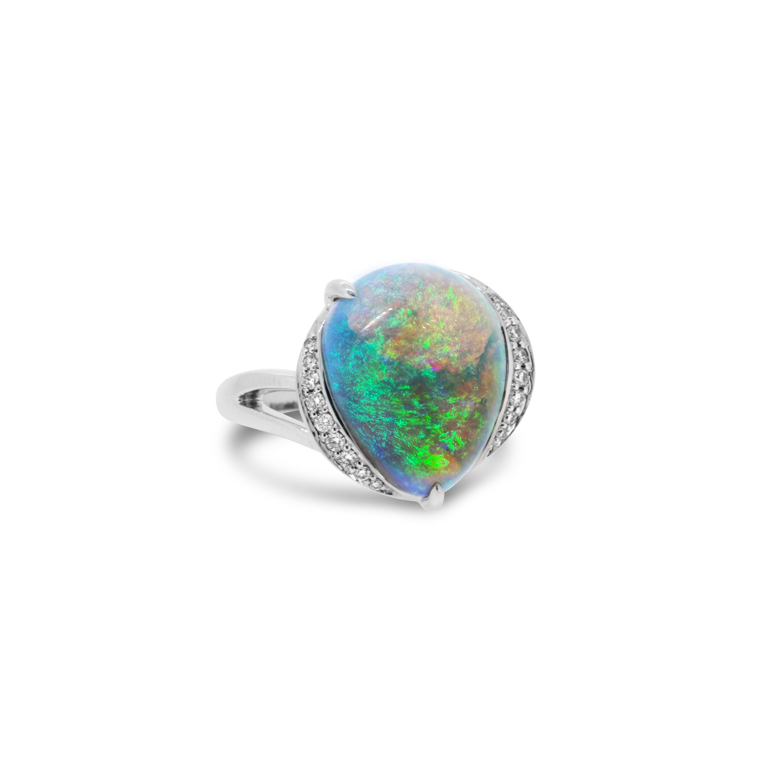 Black Opal Ring set in 18k White Gold with Diamonds exhibiting a Perfect Mixture of Green and Blue Colours