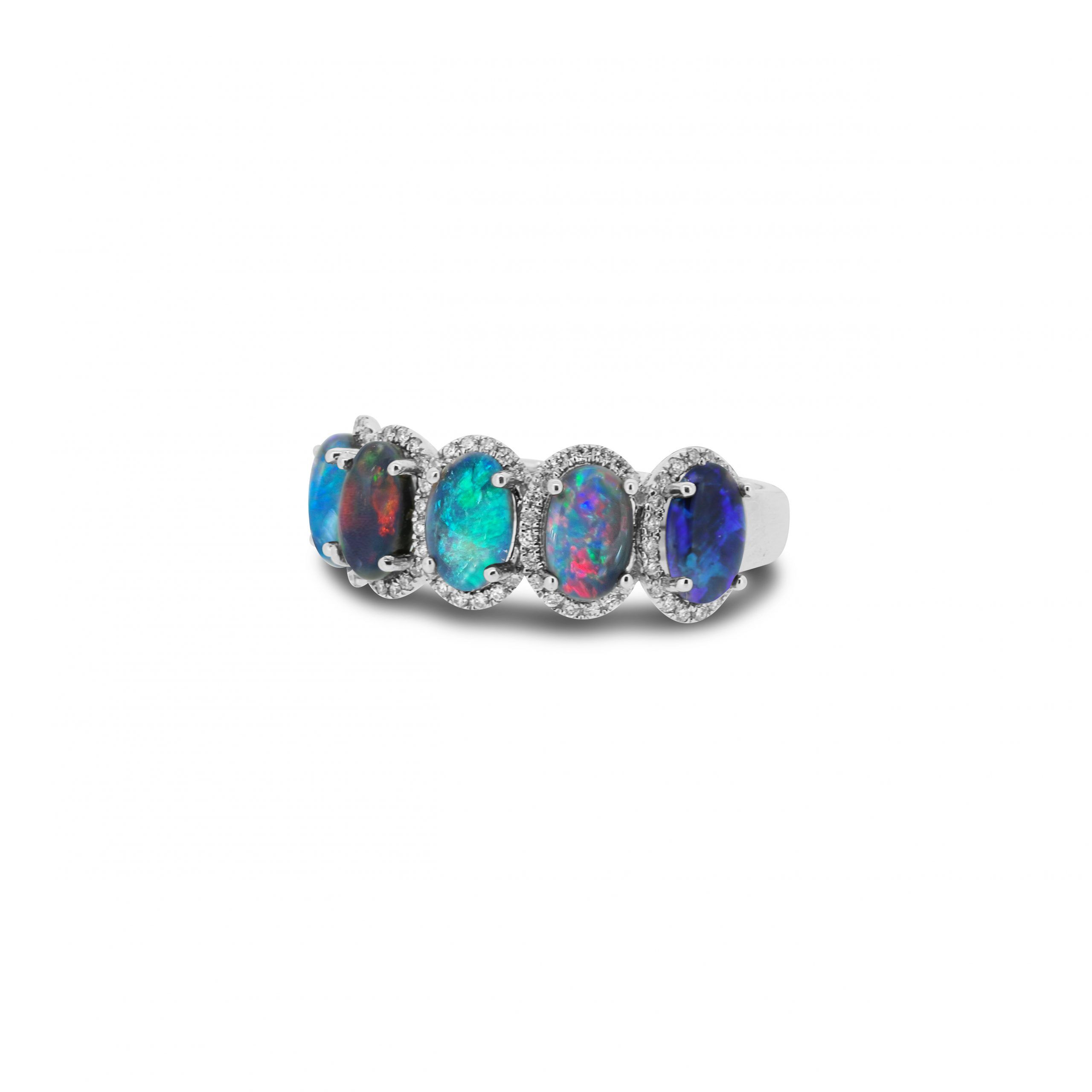 Black Opal Ring set in 18k White Gold with Diamonds exhibiting Burst of Striking Colours