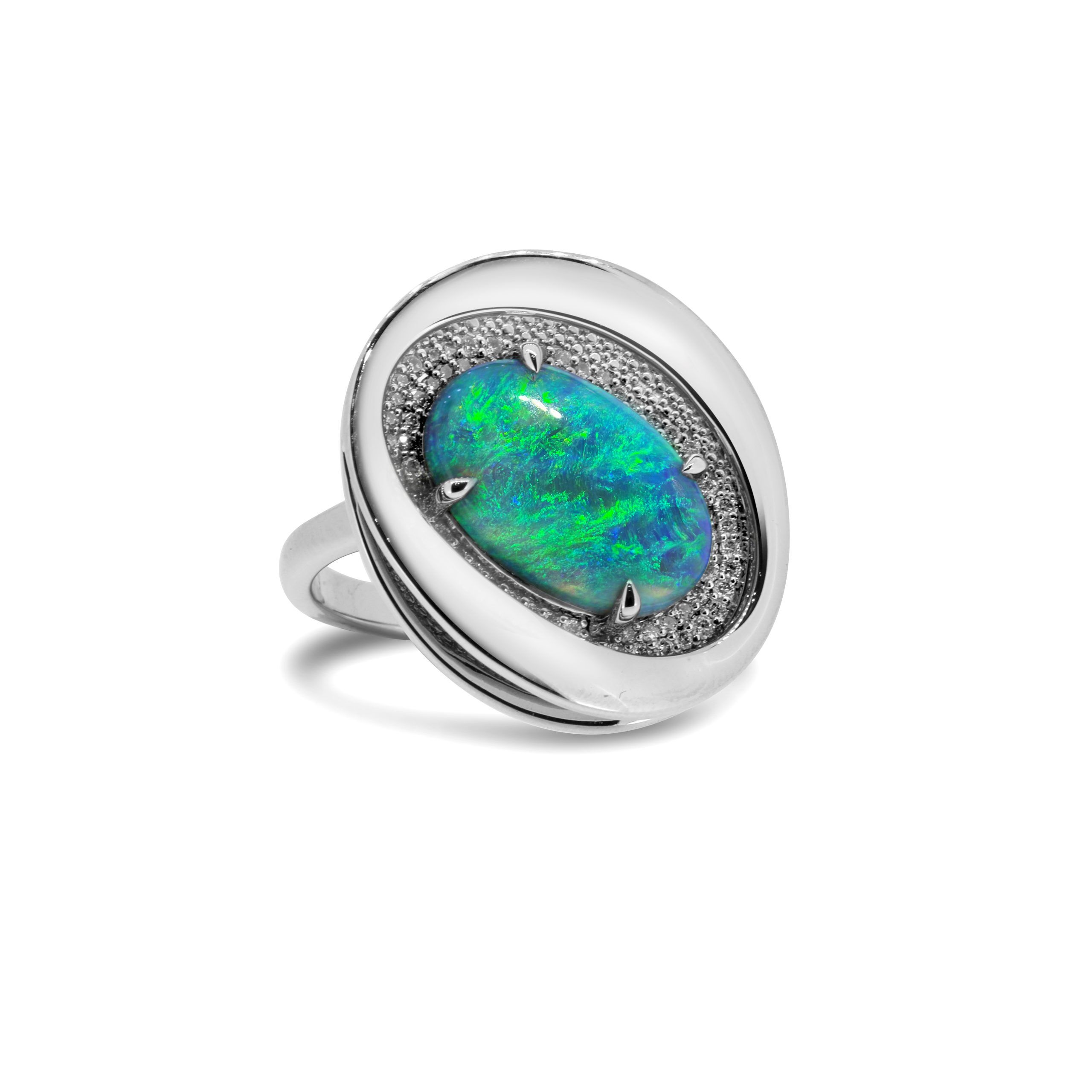 Black Opal Ring set in 18k White Gold with Diamonds exhibiting Fascinating Greens and Blues of the Ocean