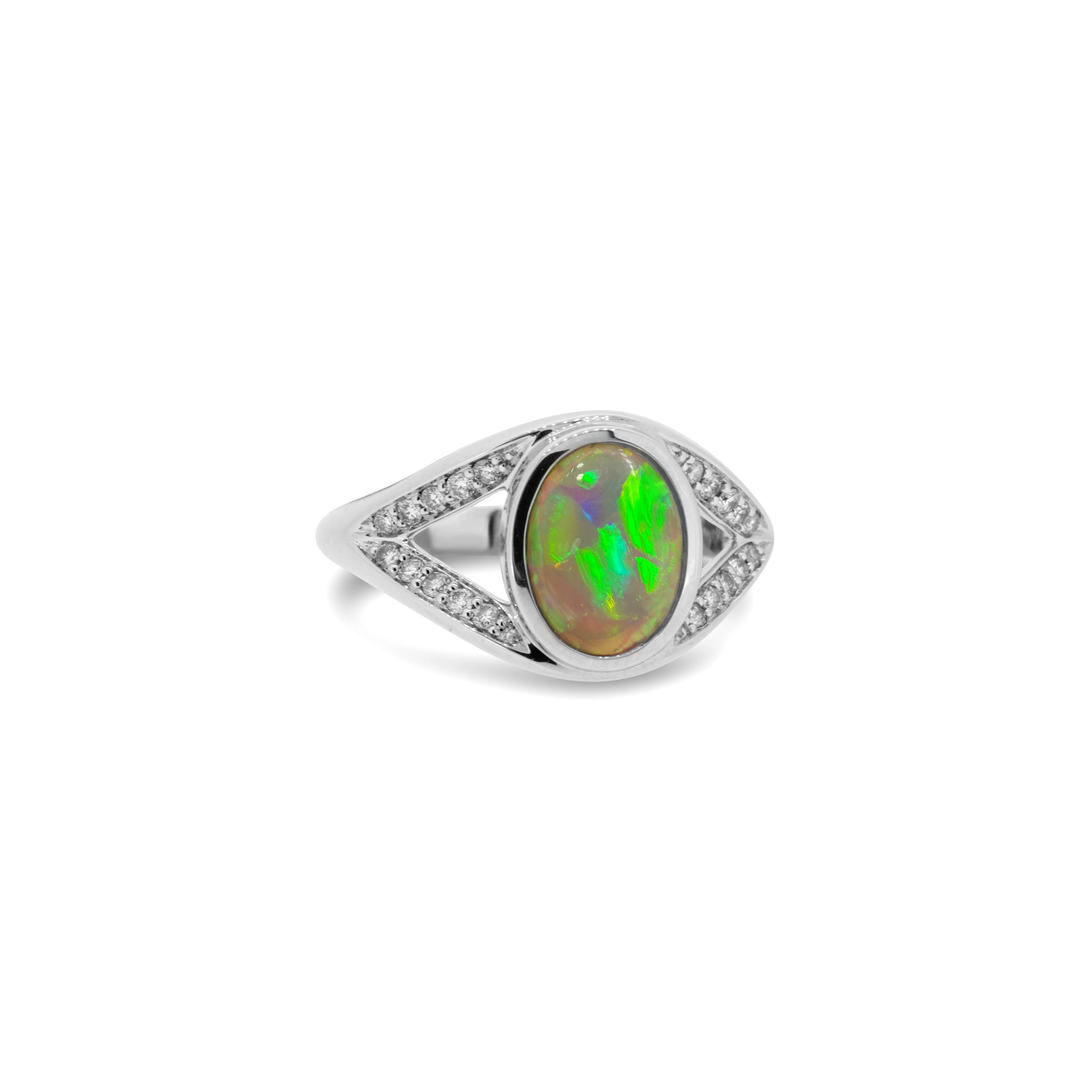 Black Opal Ring set in 18k White Gold with Diamonds exhibiting Rolling Flashes of Vivid Green