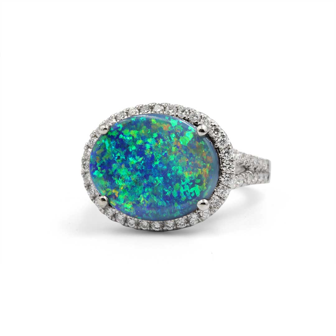 Black Opal Ring set in 18k with Diamonds displaying Flashes of Green on Blue
