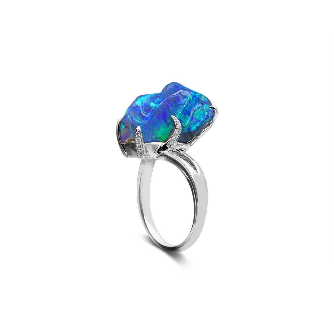 Black Opal Ring set in 18k with Diamonds displaying Waves of Blues and Greens
