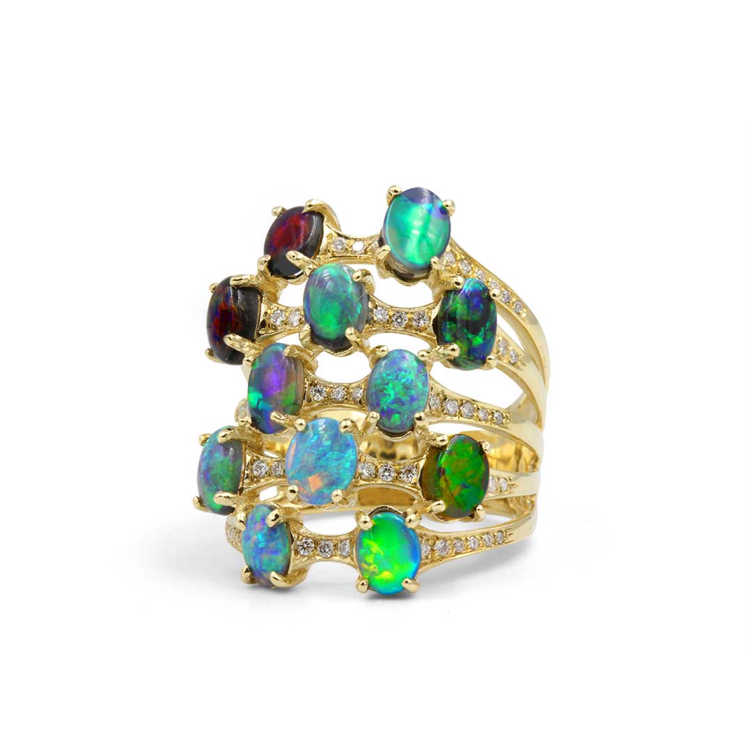 Black Opal Ring set in 18k Yellow Gold with Diamonds displaying Rolling Flashes of Peacock Colours
