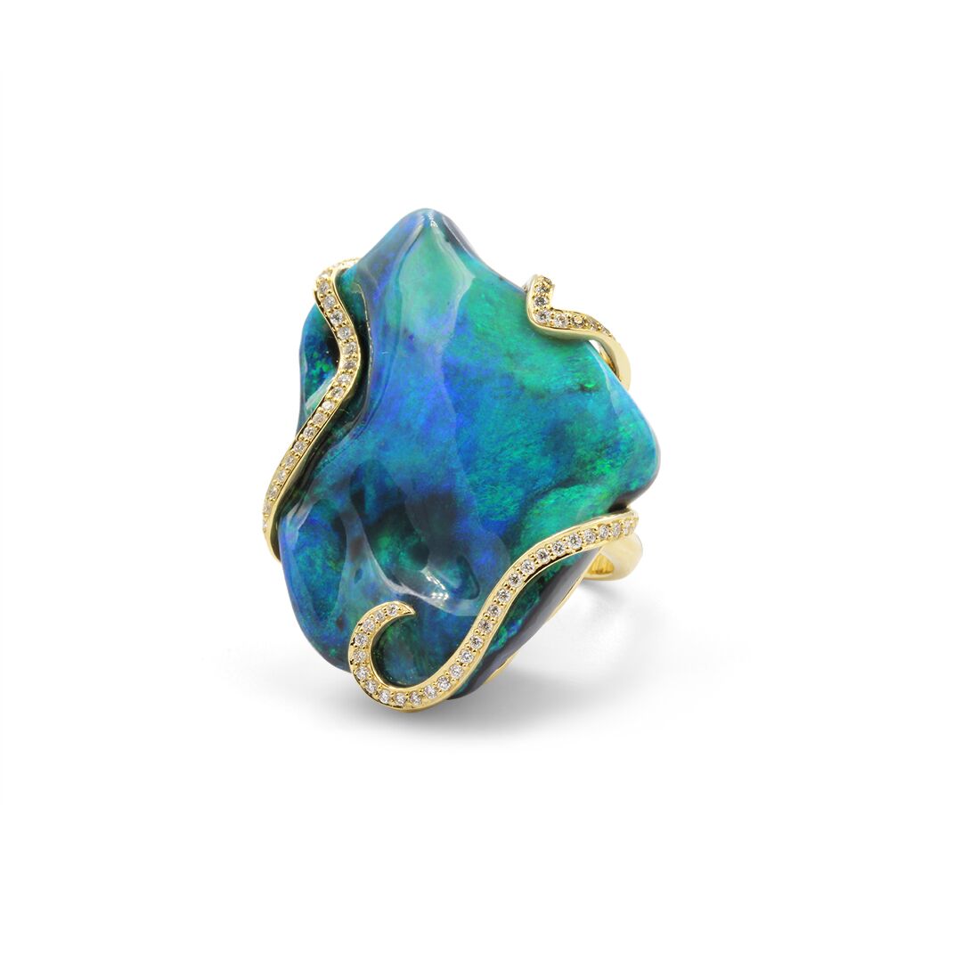 Black Opal Ring set in 18k Yellow Gold with Diamonds featuring Colours of The Tropics