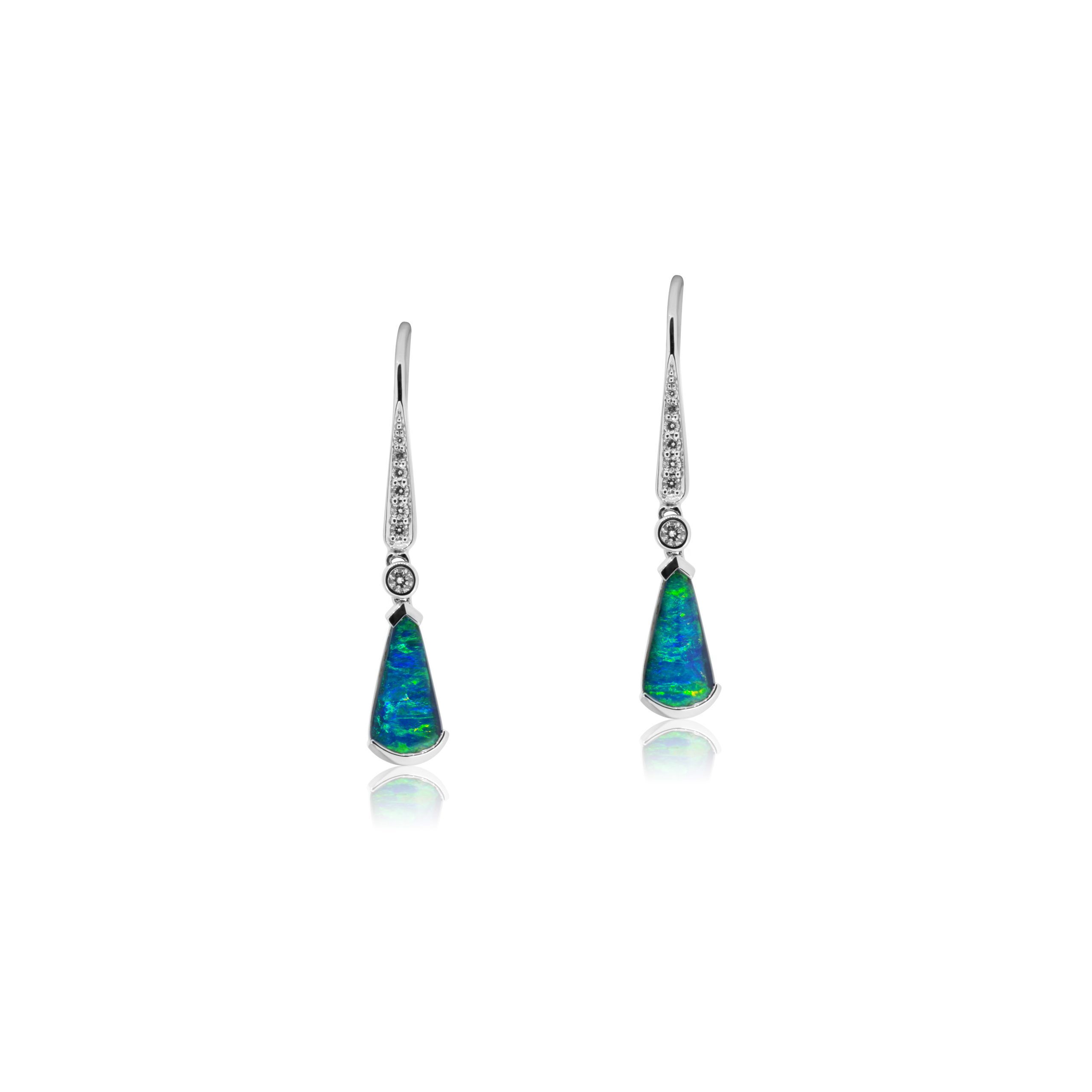 Boulder Opal Earrings set in 18k White Gold with Diamonds exhibiting Ocean Blues and Greens