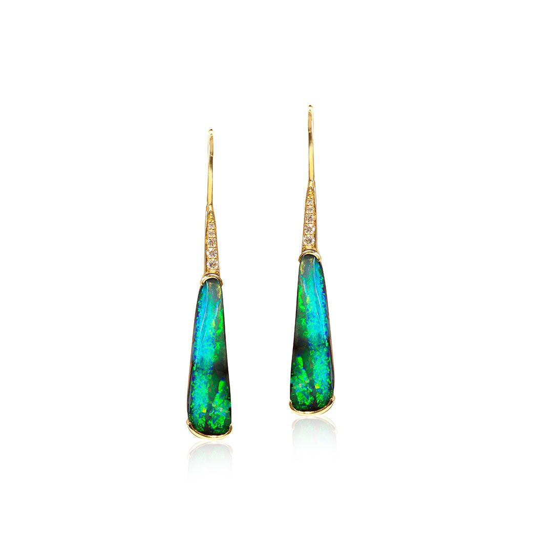 Boulder Opal Earrings set in 18k with Diamonds featuring Forest Greens