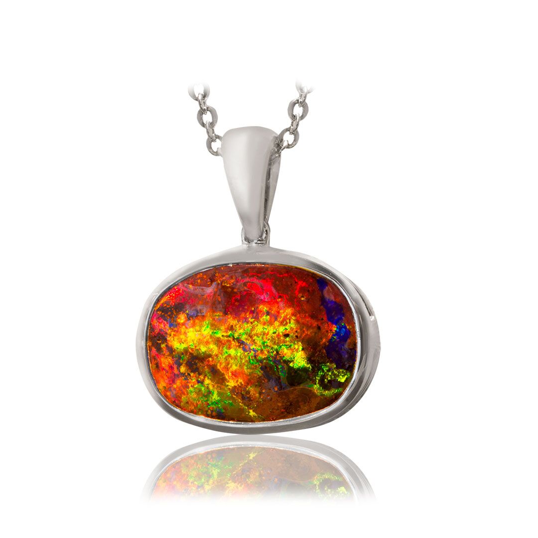 Boulder Opal Pendant set in 18k featuring Broad Flashes of Red and Orange Colours