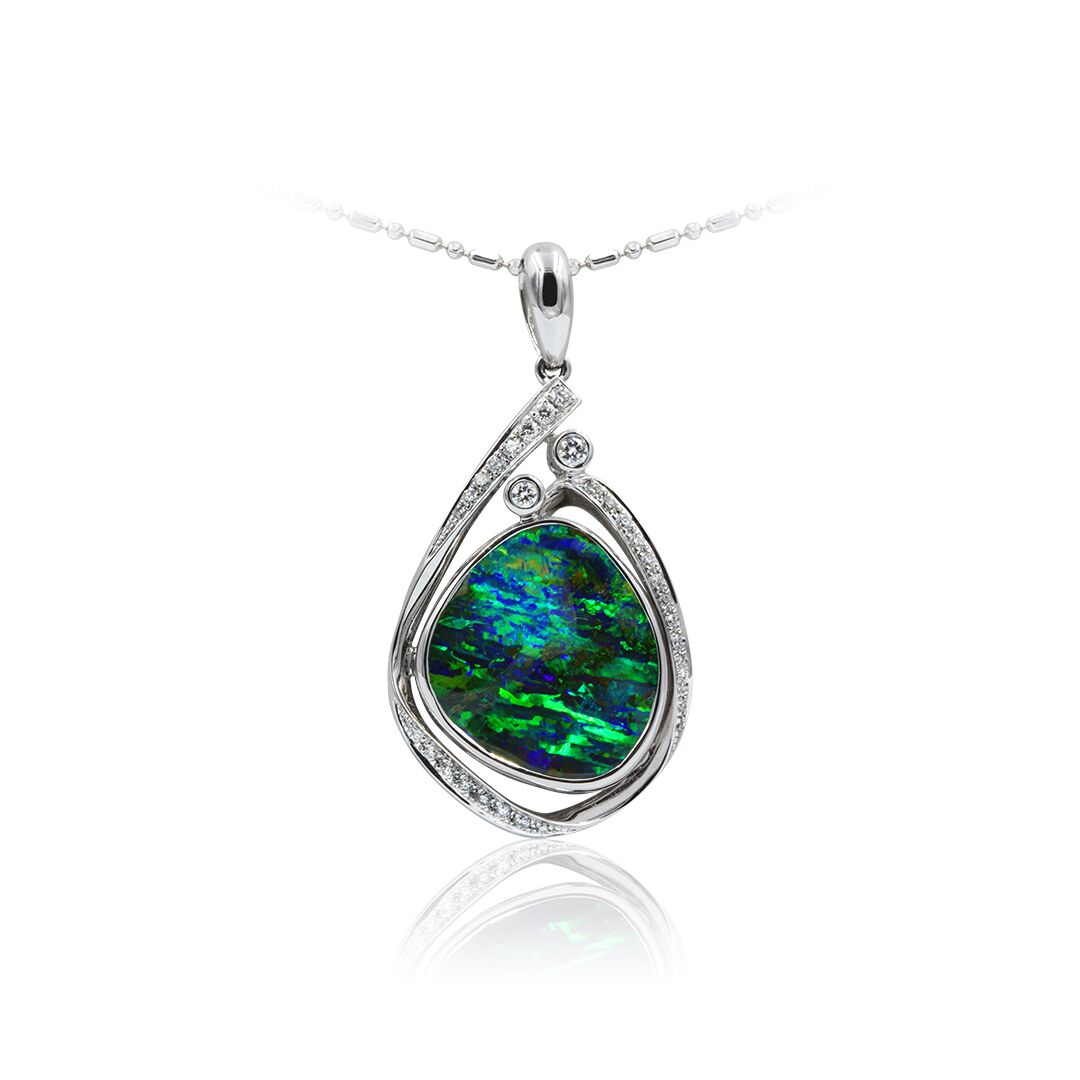 Boulder Opal Pendant set in 18k with Diamonds displaying Forest Green and Blue