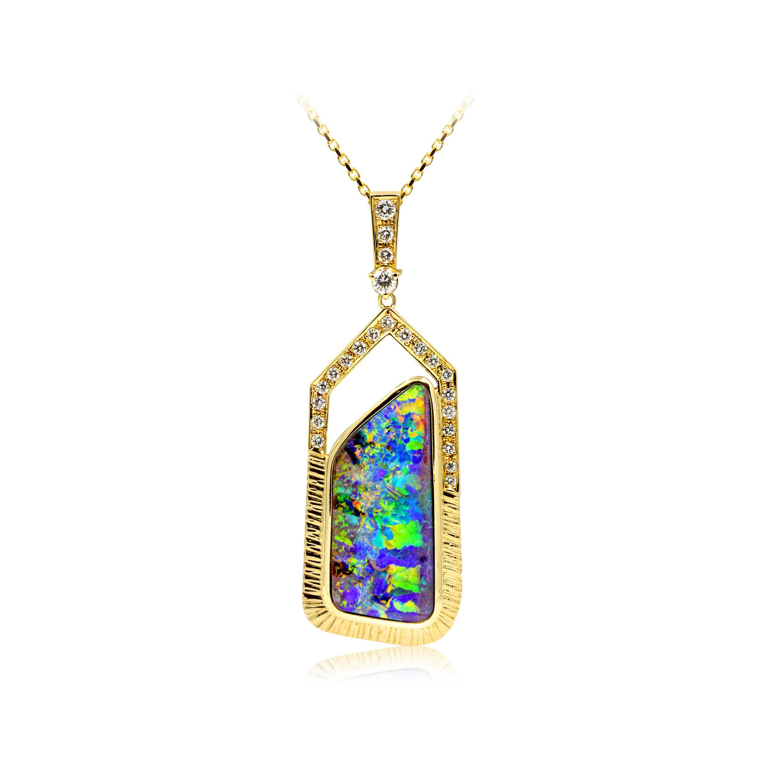 Boulder Opal Pendant set in 18k with Diamonds displaying Multi Gem Bars of Colour