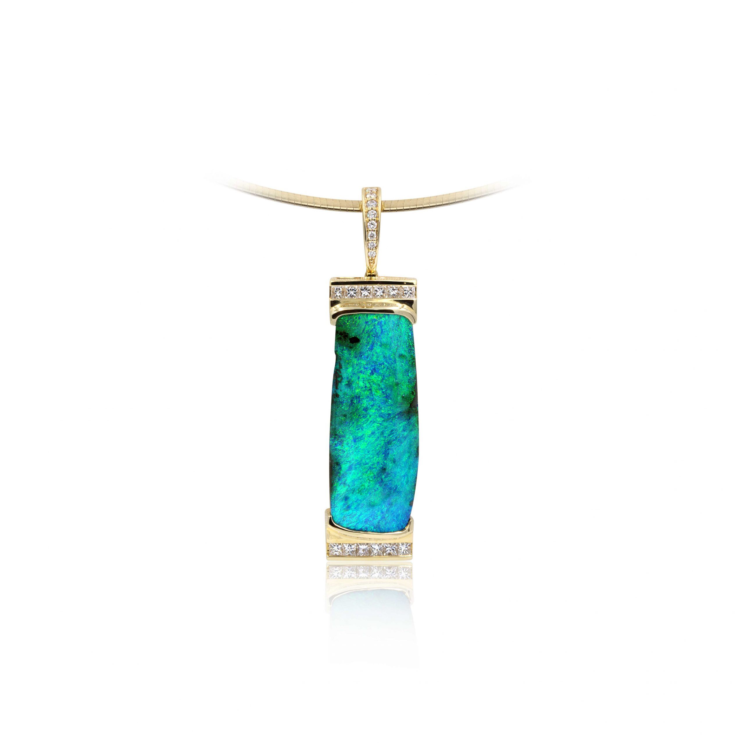 Boulder Opal Pendant set in 18k with Diamonds exhibiting Ocean Green Colours