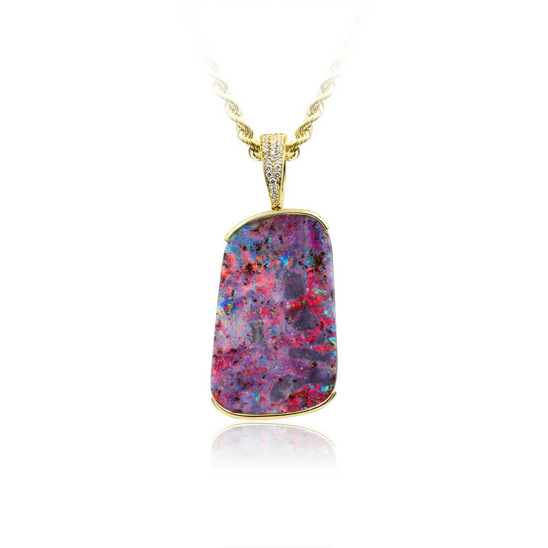 Boulder Opal Pendant set in 18k with Diamonds featuring An Artist’s Palette of Mixed Colour