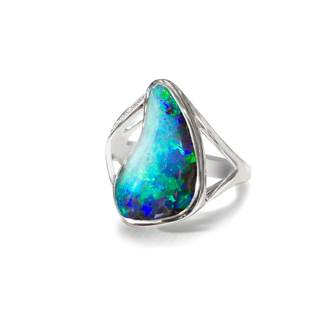 Boulder Opal Ring in 18k with Diamonds featuring Segmented Colours of Blue and Green