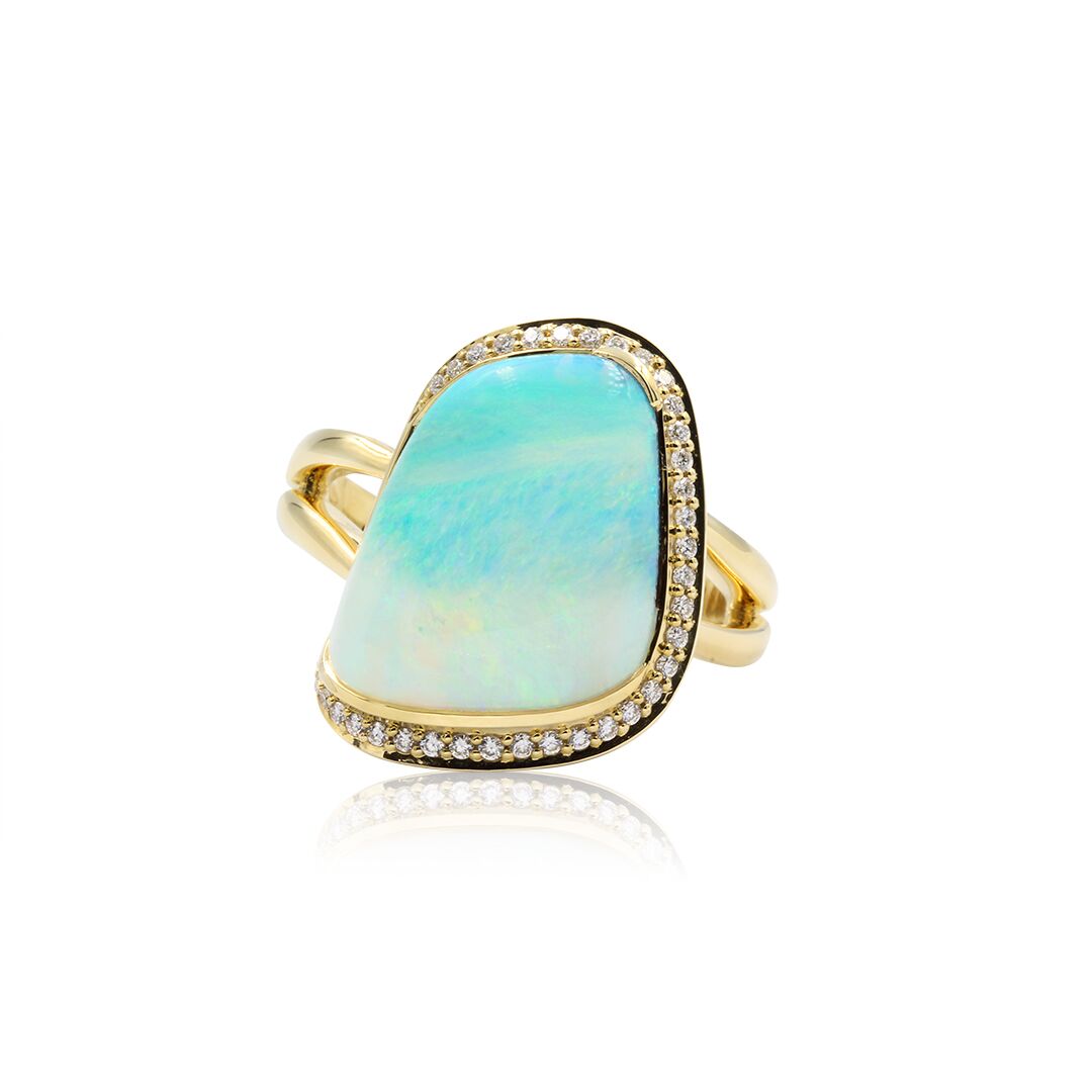 Boulder Opal Ring set in 18k with Diamonds displaying Aqua Blue Colours