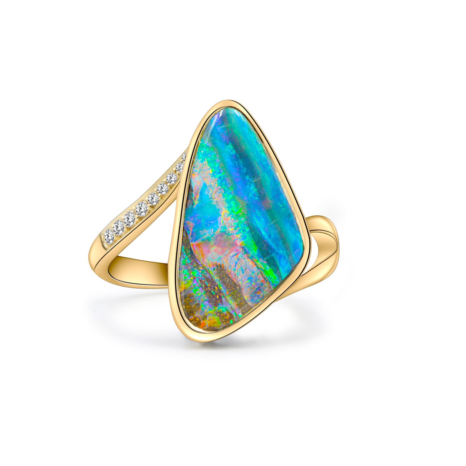 Boulder Opal Ring set in 18k with Diamonds featuring Ribbons of Colour