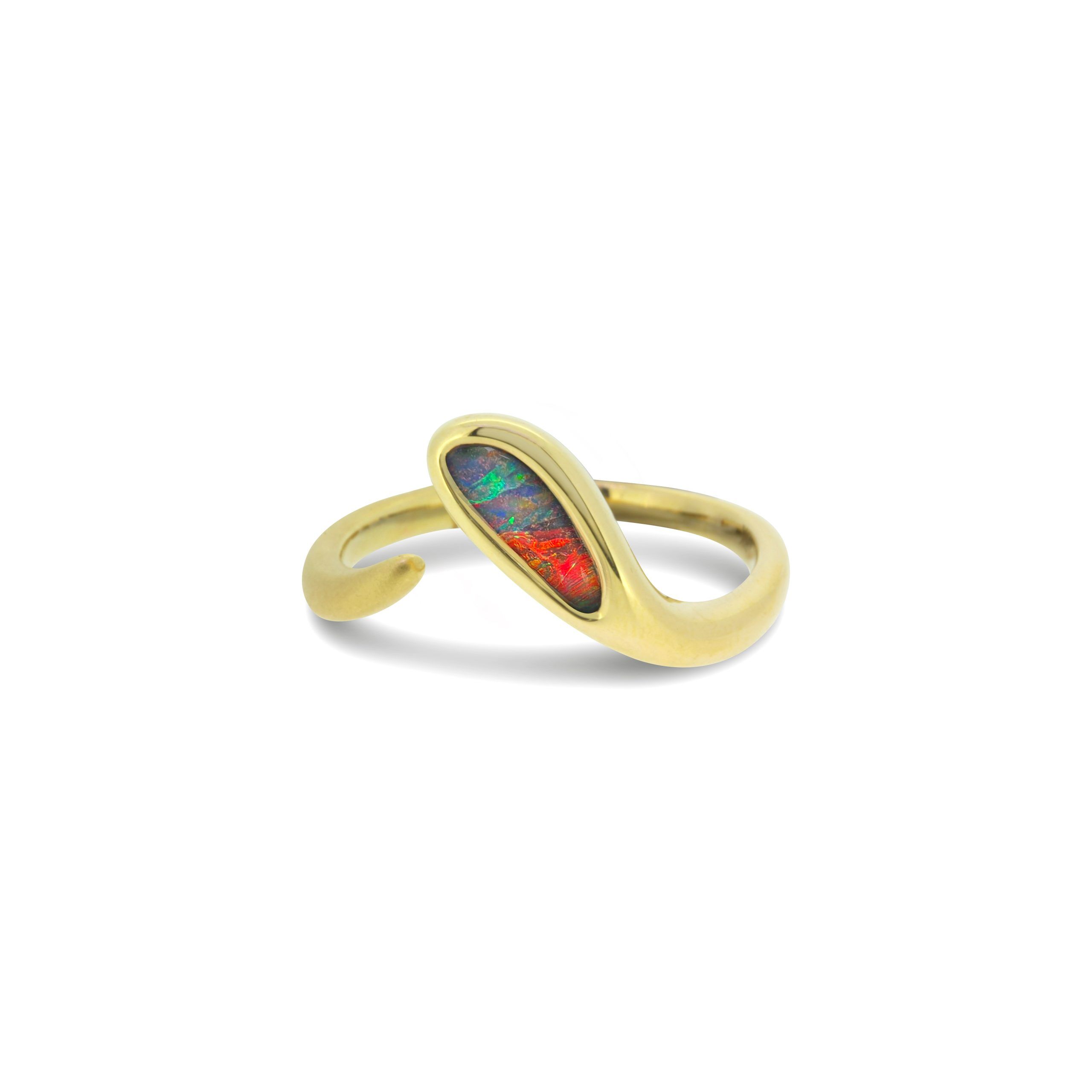 Boulder Opal Ring set in 18k Yellow Gold displaying Passionate Reds, Vivid Greens and Blues