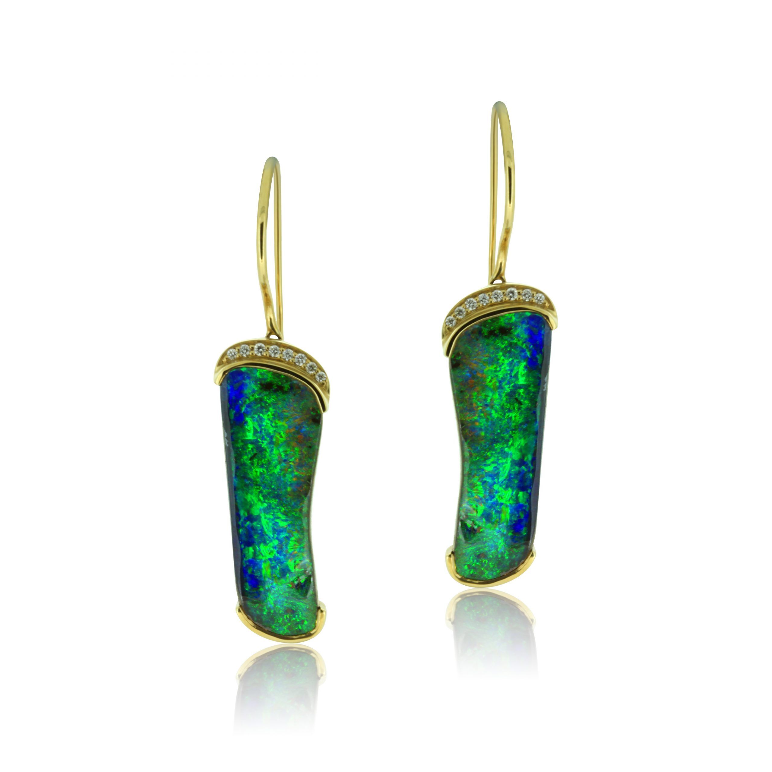 Elegant Boulder Opal Earrings set in 18k Yellow Gold with Diamonds featuring Brilliant Forest Greens