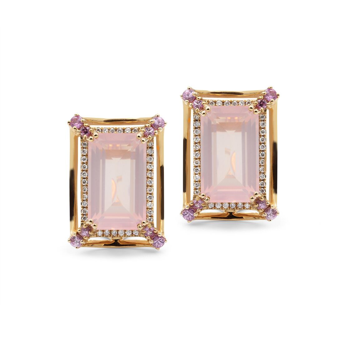 Emerald Cut Rose Quartz Earrings set in 18k with Diamonds and Pink Sapphires