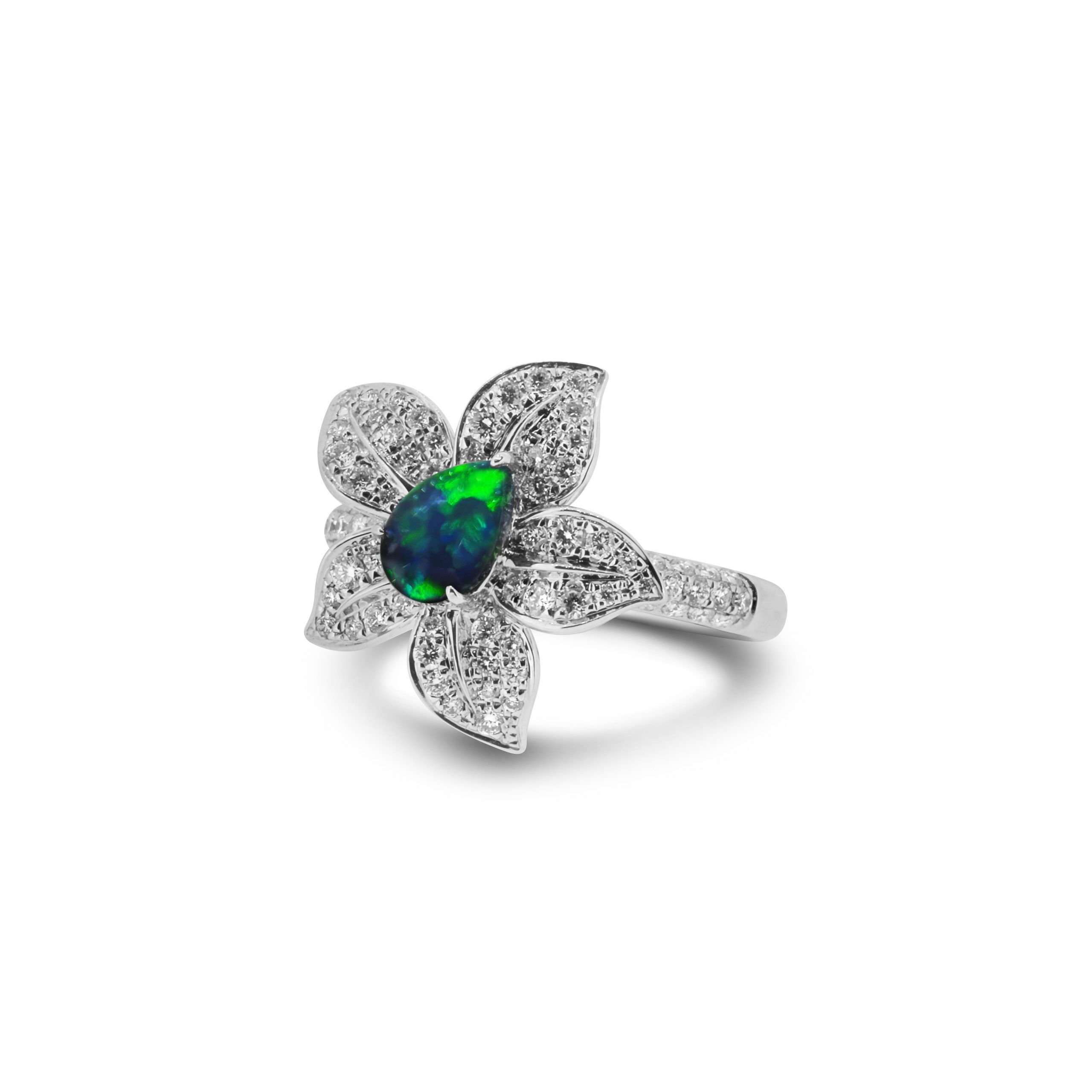 Exquisite Black Opal Ring set in 18k White Gold with Diamonds featuring Rolling Flashes of Greens