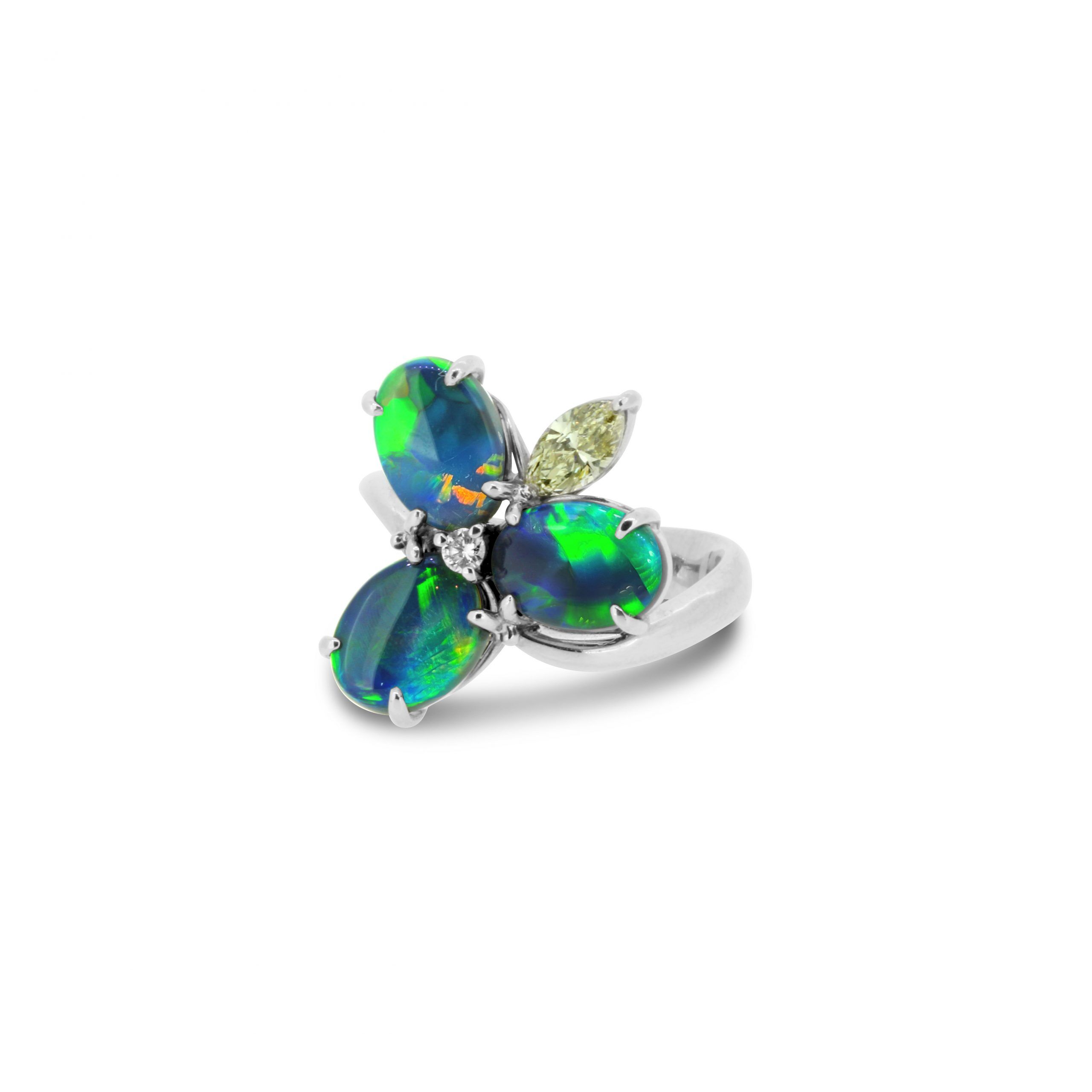 Exquisite Black Opal Ring set in Platinum with Diamonds featuring Rolling Flashes of Greens and Oranges