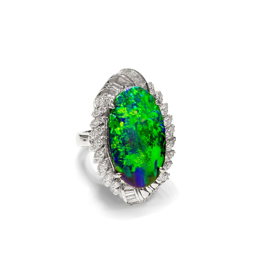 Gem Grade Black Opal Ring in Platinum featuring Rolling Flashes of Green, Orange and Blue Colours