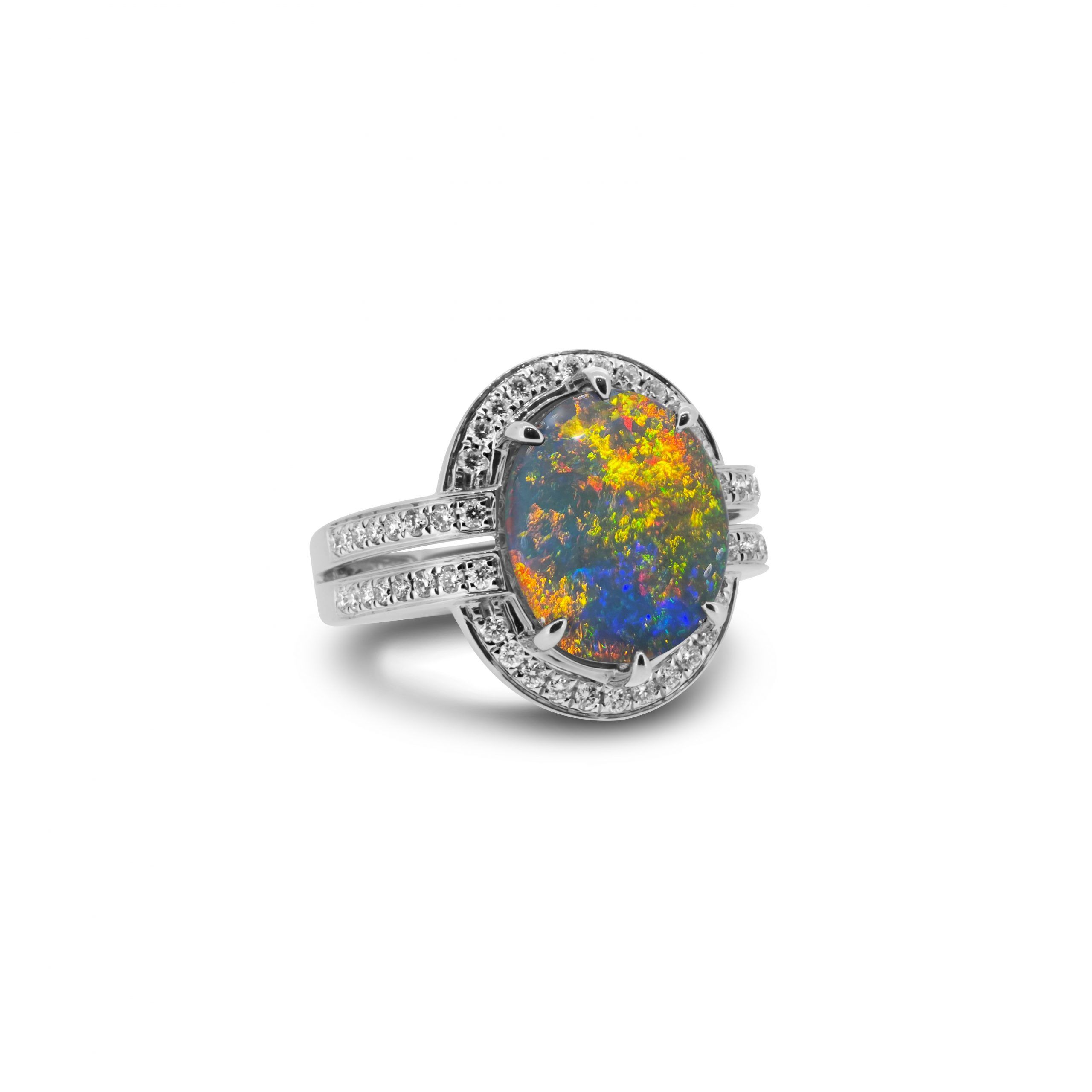 Gem Grade Black Opal Ring set in 18k White Gold with Diamonds featuring Burst of Striking Oranges and Blues