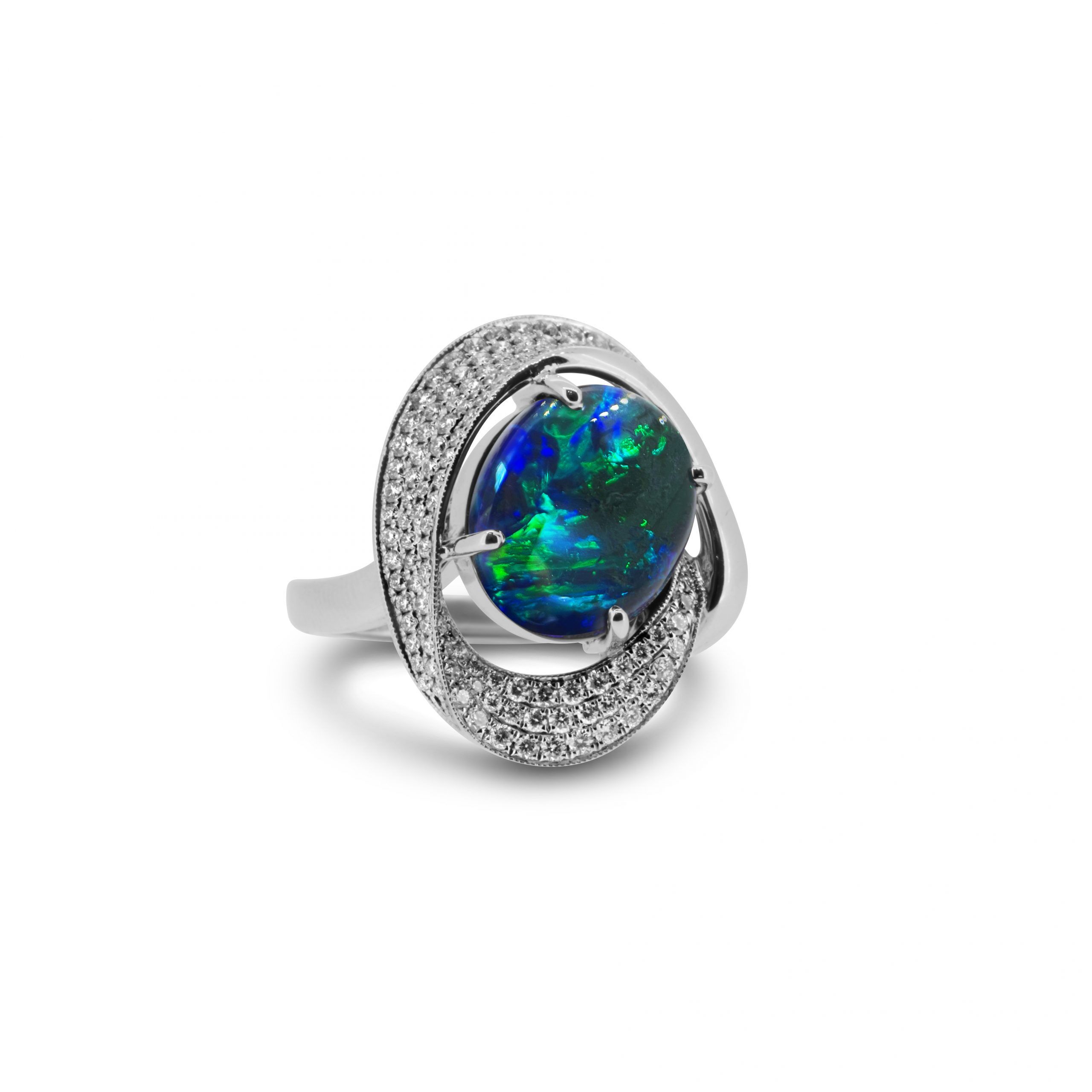 Gem Grade Black Opal Ring set in 18k White Gold with Diamonds featuring Mysterious Flashes of Greens and Blues