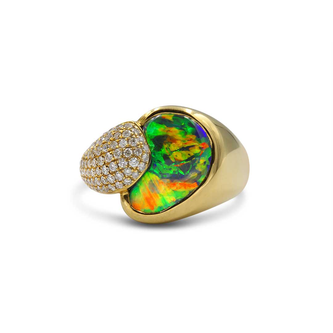 Gem Grade Black Opal Ring set in 18k Yellow Gold featuring Broad Flash of Mesmerising Colours