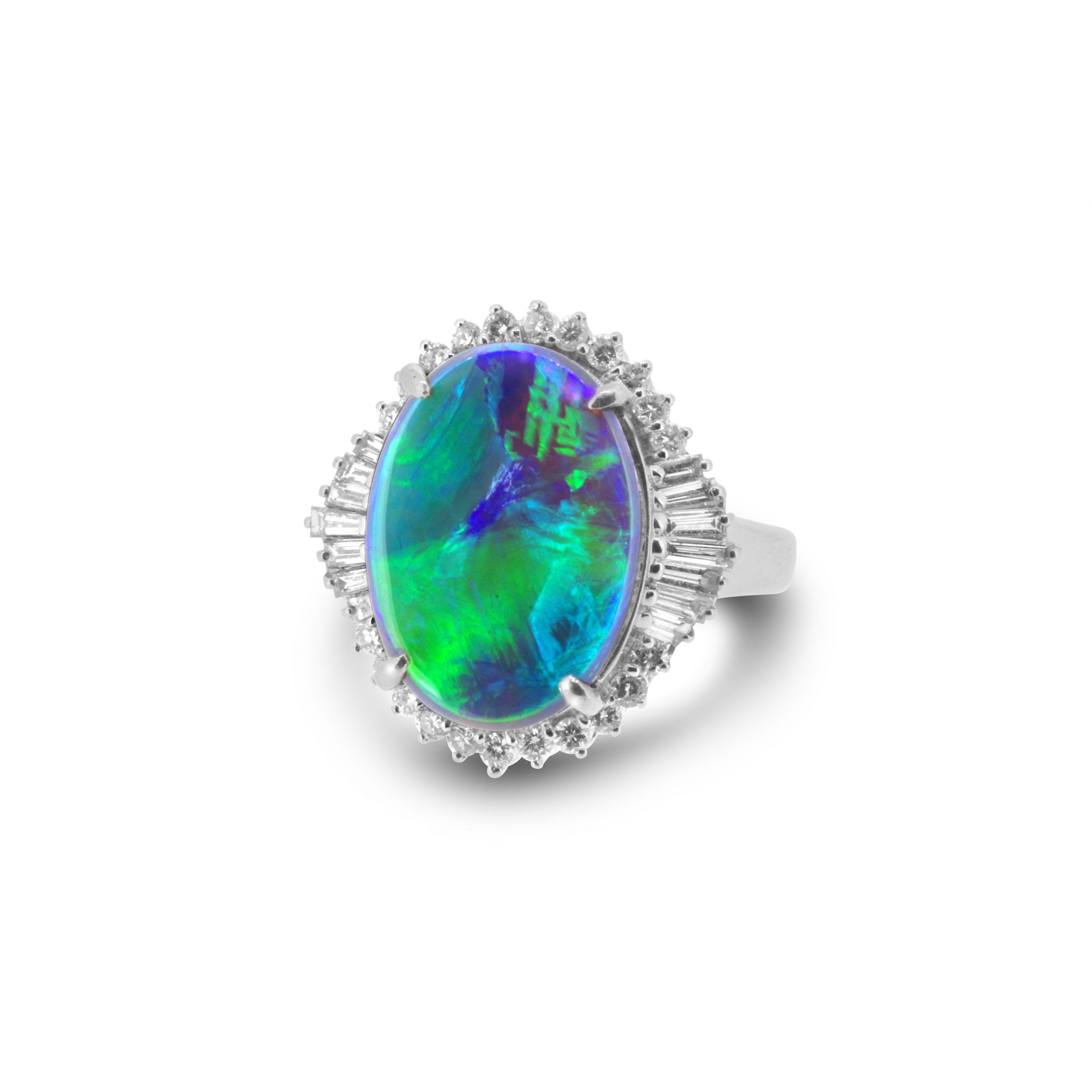 Gem Grade Black Opal Ring set in Platinum with Diamonds displaying Flashes of Ocean Greens and Blues