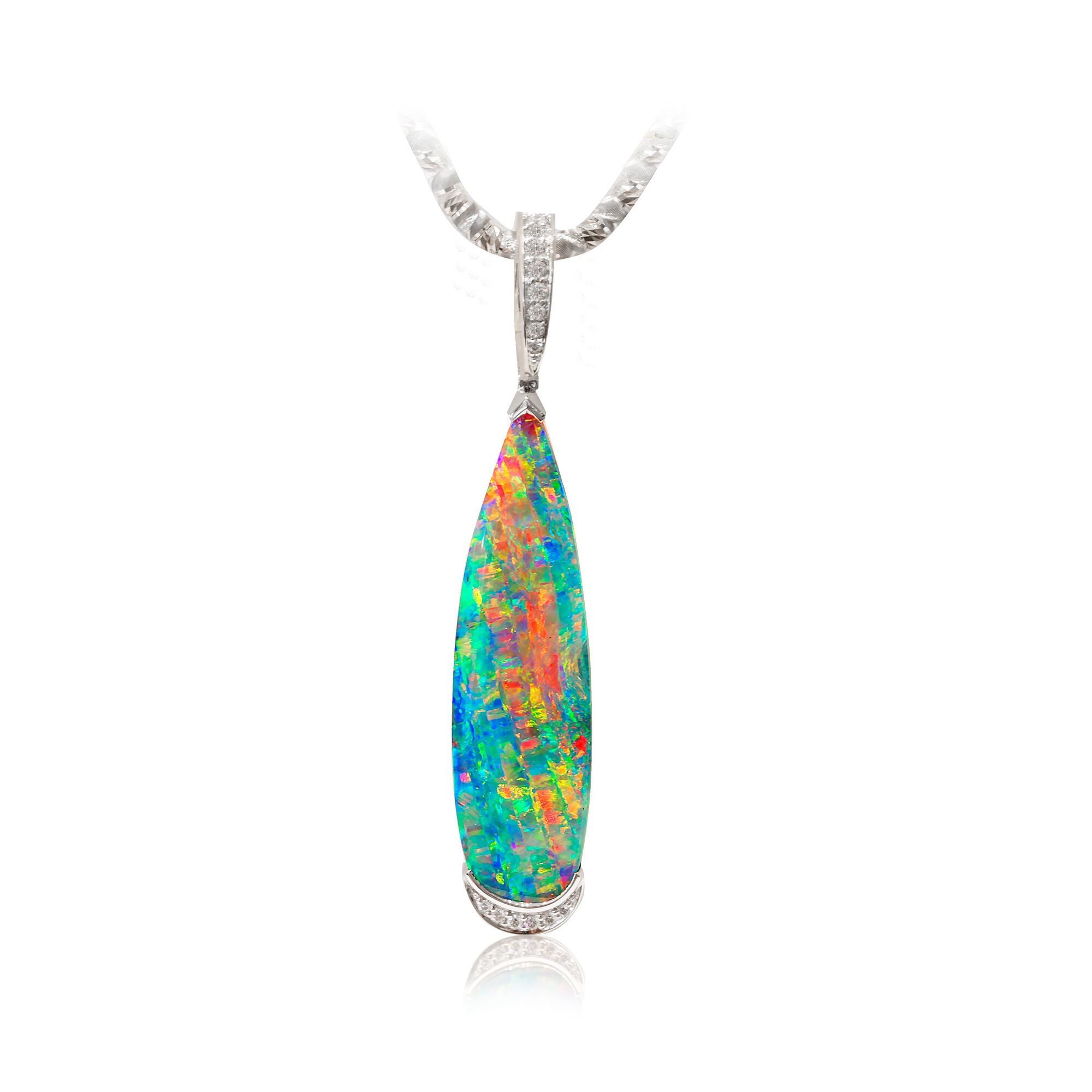 Gem Grade Boulder Opal Pendant set in 18k featuring Rolling Flashes of Rainbow Colours
