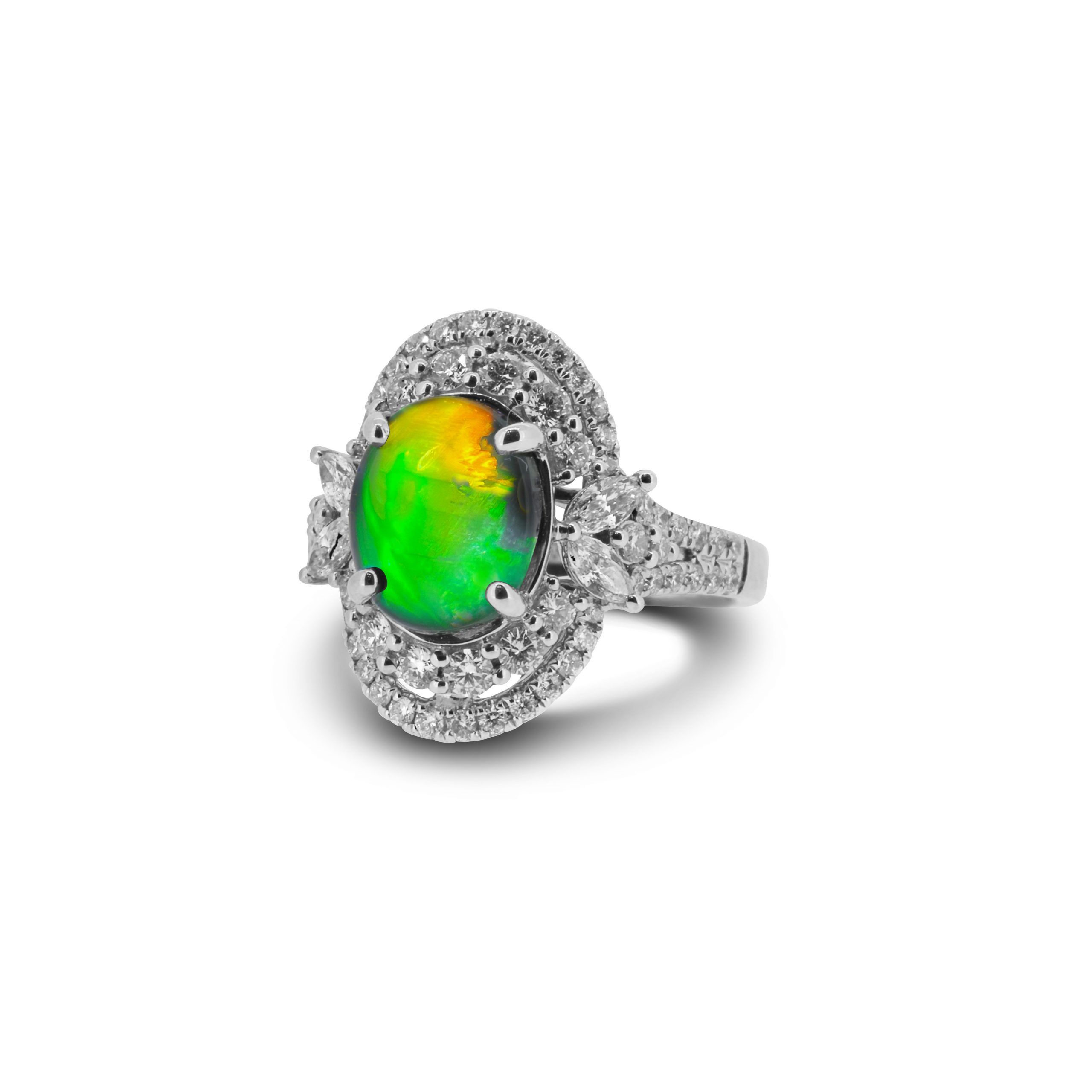 Gem Grade Black Opal Ring set in 18k White Gold with Diamonds exhibiting Incredibly Vivid Flashes of Orange and Green