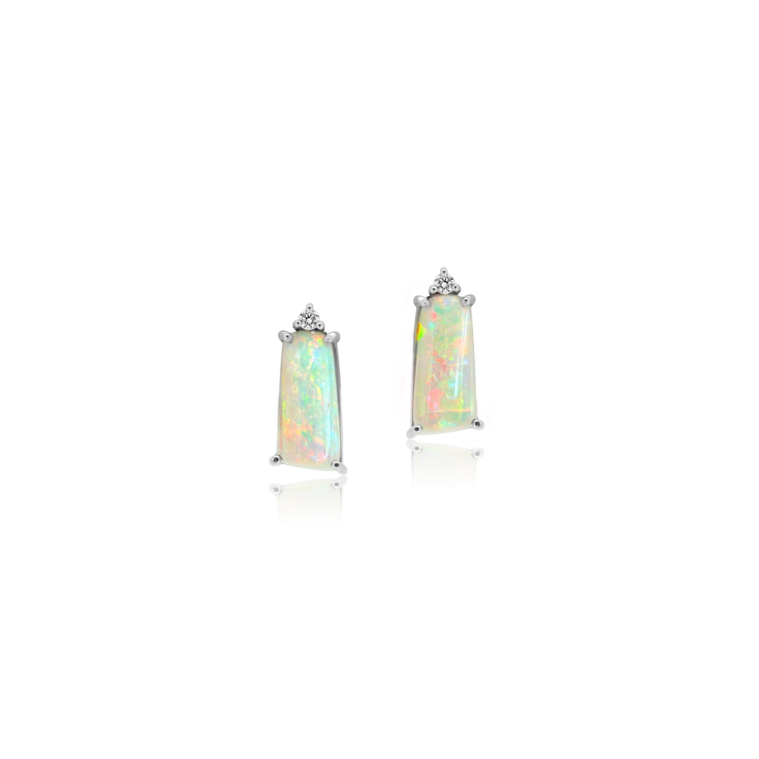 White Opal Earrings set in 18k White Gold with Diamonds displaying Lovely Colours of the Rainbow